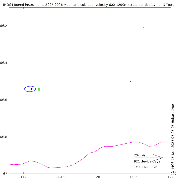 These maps show some basic analyses of the velocity data: mean (all-time in black and seasonal in colour) and sub-tidal variance for several layers and time-windows, and tidal harmonics for the depth-average velocity using the whole record. Click through to see more detailed plots of the selected dataset or to download those data from the AODN thredds server.