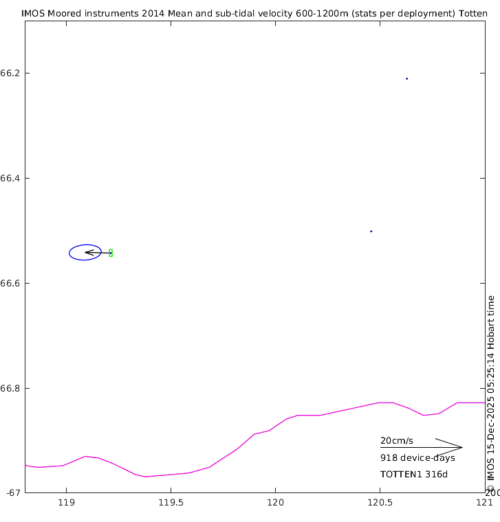 These maps show some basic analyses of the velocity data: mean (all-time in black and seasonal in colour) and sub-tidal variance for several layers and time-windows, and tidal harmonics for the depth-average velocity using the whole record. Click through to see more detailed plots of the selected dataset or to download those data from the AODN thredds server.