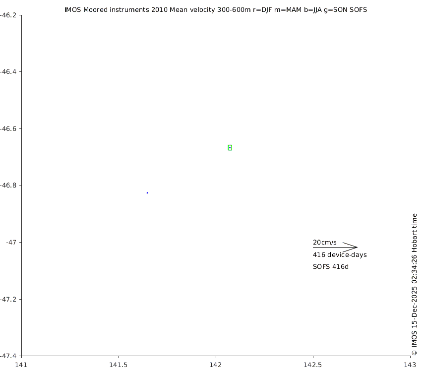 These maps show some basic analyses of the velocity data: mean (all-time in black and seasonal in colour) and sub-tidal variance for several layers and time-windows, and tidal harmonics for the depth-average velocity using the whole record. Click through to see more detailed plots of the selected dataset or to download those data from the AODN thredds server.