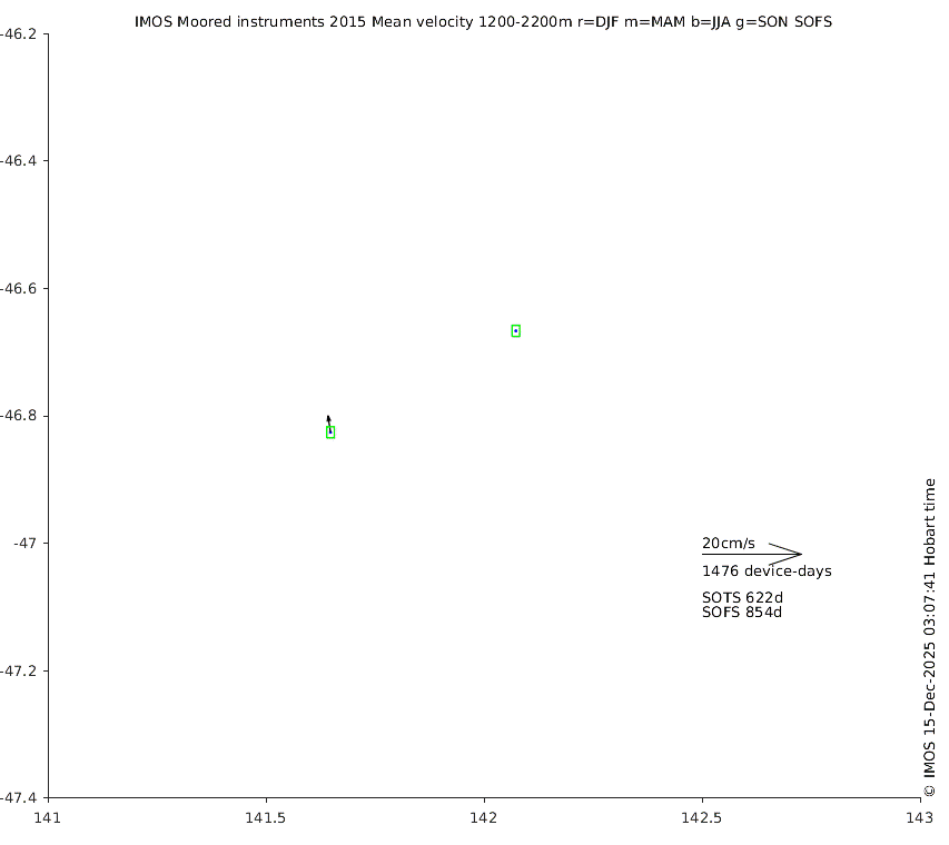 These maps show some basic analyses of the velocity data: mean (all-time in black and seasonal in colour) and sub-tidal variance for several layers and time-windows, and tidal harmonics for the depth-average velocity using the whole record. Click through to see more detailed plots of the selected dataset or to download those data from the AODN thredds server.