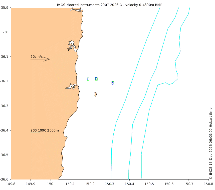These maps show some basic analyses of the velocity data: mean (all-time in black and seasonal in colour) and sub-tidal variance for several layers and time-windows, and tidal harmonics for the depth-average velocity using the whole record. Click through to see more detailed plots of the selected dataset or to download those data from the AODN thredds server.