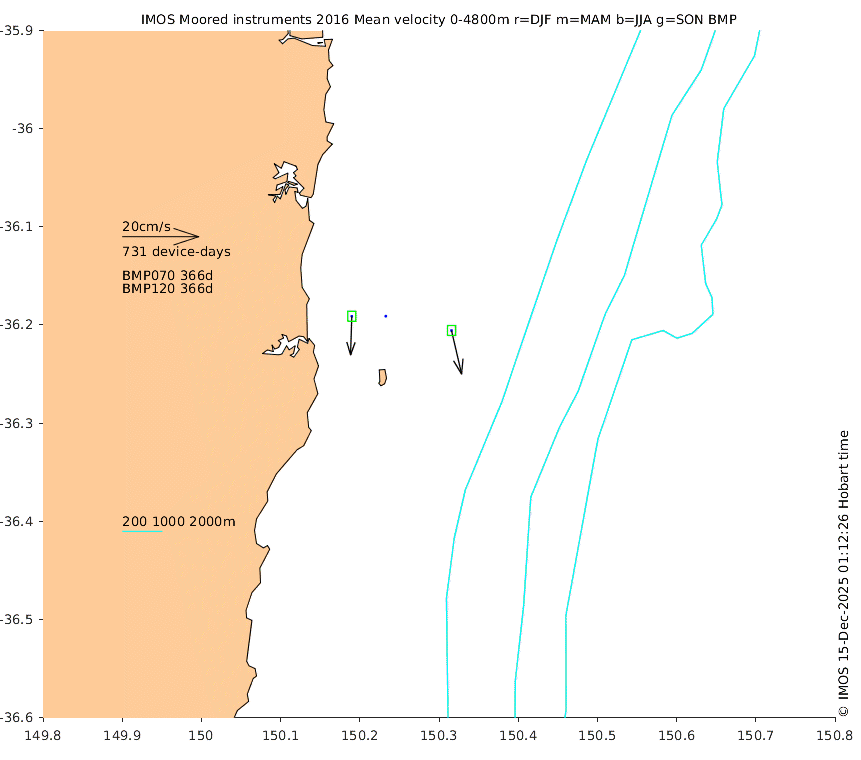 These maps show some basic analyses of the velocity data: mean (all-time in black and seasonal in colour) and sub-tidal variance for several layers and time-windows, and tidal harmonics for the depth-average velocity using the whole record. Click through to see more detailed plots of the selected dataset or to download those data from the AODN thredds server.