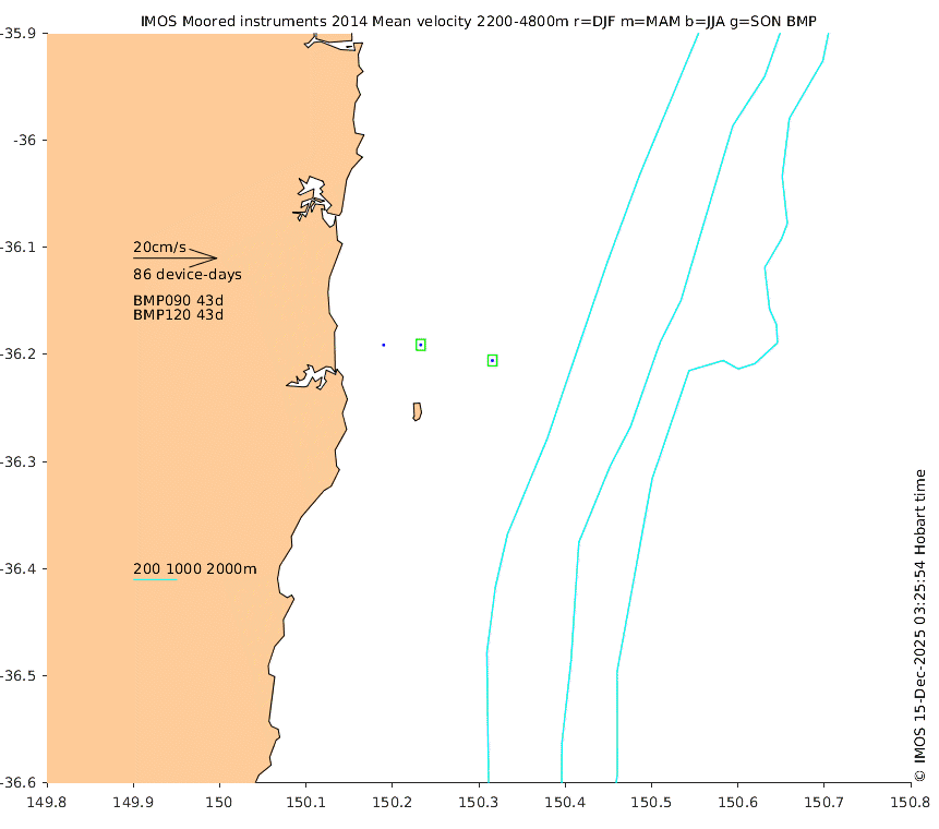 These maps show some basic analyses of the velocity data: mean (all-time in black and seasonal in colour) and sub-tidal variance for several layers and time-windows, and tidal harmonics for the depth-average velocity using the whole record. Click through to see more detailed plots of the selected dataset or to download those data from the AODN thredds server.