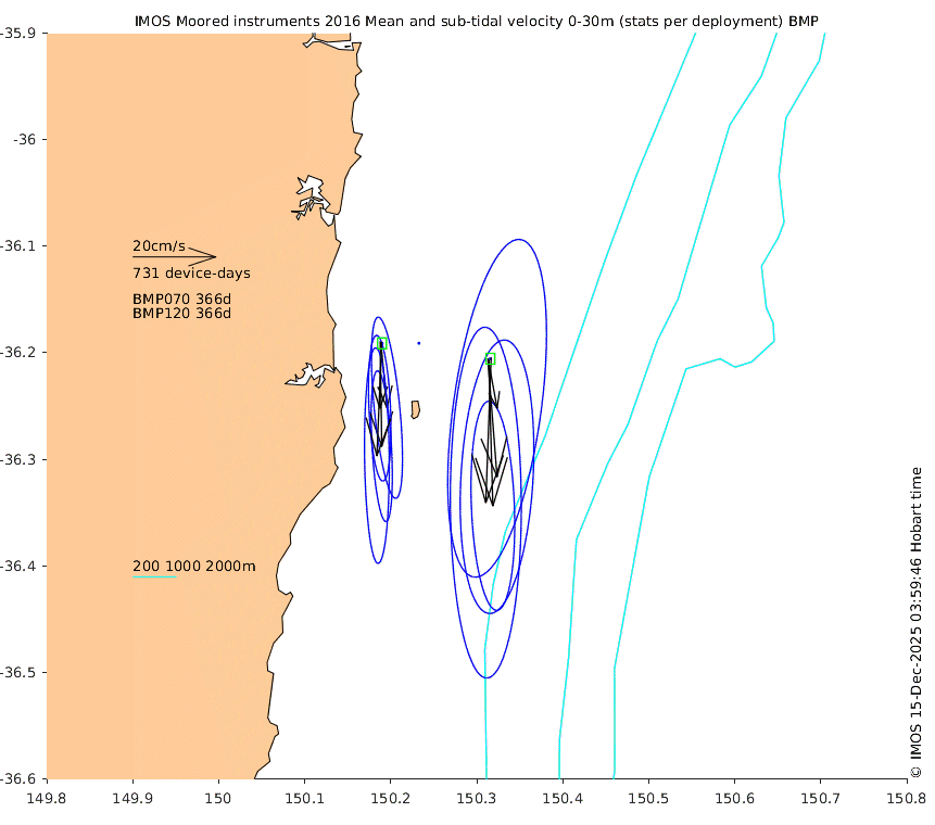 These maps show some basic analyses of the velocity data: mean (all-time in black and seasonal in colour) and sub-tidal variance for several layers and time-windows, and tidal harmonics for the depth-average velocity using the whole record. Click through to see more detailed plots of the selected dataset or to download those data from the AODN thredds server.
