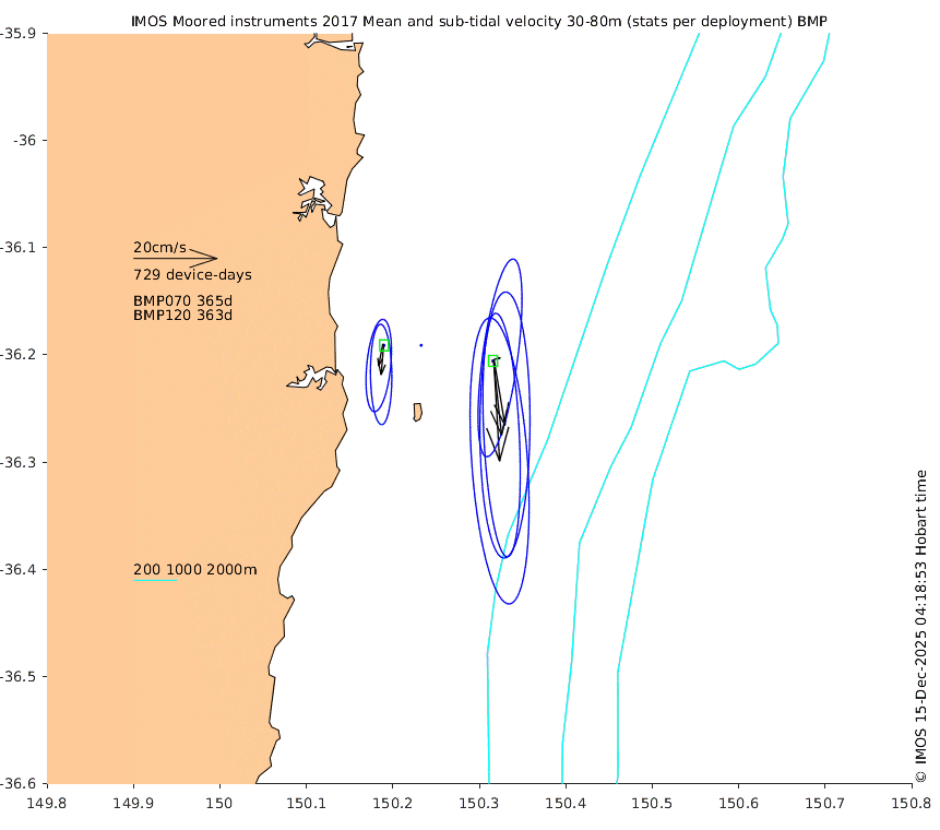 These maps show some basic analyses of the velocity data: mean (all-time in black and seasonal in colour) and sub-tidal variance for several layers and time-windows, and tidal harmonics for the depth-average velocity using the whole record. Click through to see more detailed plots of the selected dataset or to download those data from the AODN thredds server.