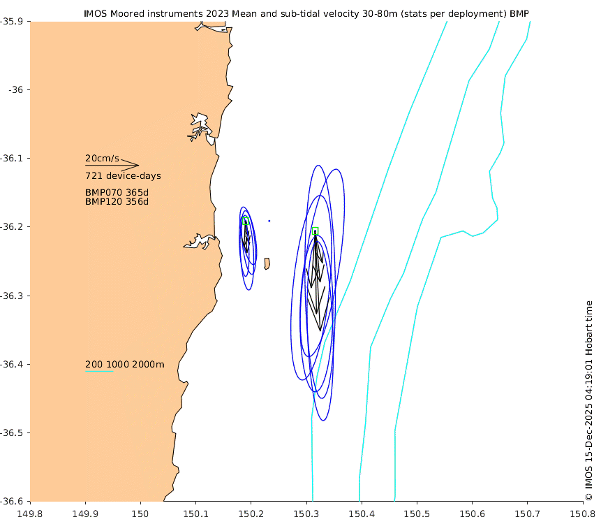 These maps show some basic analyses of the velocity data: mean (all-time in black and seasonal in colour) and sub-tidal variance for several layers and time-windows, and tidal harmonics for the depth-average velocity using the whole record. Click through to see more detailed plots of the selected dataset or to download those data from the AODN thredds server.