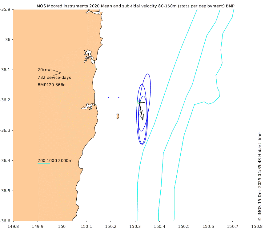 These maps show some basic analyses of the velocity data: mean (all-time in black and seasonal in colour) and sub-tidal variance for several layers and time-windows, and tidal harmonics for the depth-average velocity using the whole record. Click through to see more detailed plots of the selected dataset or to download those data from the AODN thredds server.
