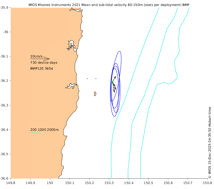 These maps show some basic analyses of the velocity data: mean (all-time in black and seasonal in colour) and sub-tidal variance for several layers and time-windows, and tidal harmonics for the depth-average velocity using the whole record. Click through to see more detailed plots of the selected dataset or to download those data from the AODN thredds server.