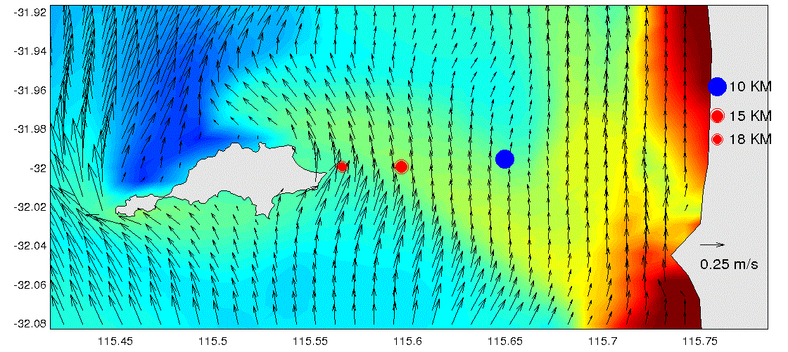 The Bureau of Meteorology is forecasting southerly winds (15-20 km/h) at dawn then turning south to south-westerly and strengthening (20-30 km/h) in the late morning. The Oceans Institute of the University of Western Australia ocean current forecast is for northward currents throughout the race, weak near the coast and strongest (0.25 m/s at midday) after the 15 km mark, as shown in the images below (click to see them enlarged). Northward currents are anticipated to increase from midday due to the sea breeze, making the approach to the island most difficult near the cutoff time.