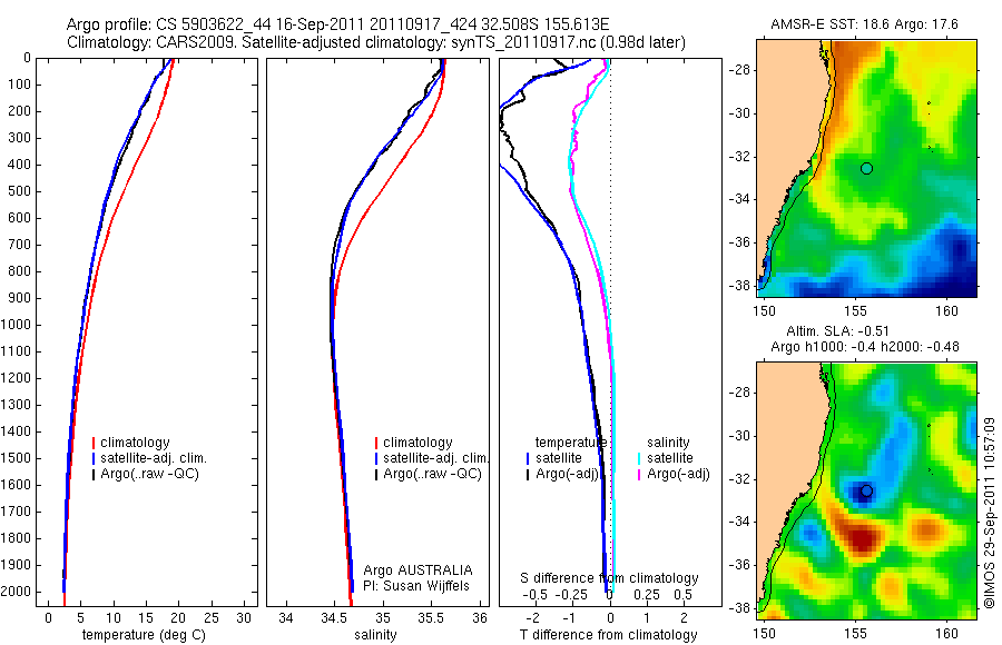 This shows the altimetric sea level anomaly (colour bar is -0.6 to 0.6m) for comparison with h1000, the surface steric height anomaly relative to 1000m. These are different quantities, the first estimated at coarse resolution from space and the second by an in-situ device, so the estimates are bound to disagree to some extent. They usually do agree within +/-0.15m, however, confirming that most of the sea level anomaly (ie, the difference from the time-mean of inverse-barometer adjusted sea level) is due to the anomaly (ie, the difference from the CARS2009 time-mean) of the vertical-integral from 1000m of the water density. This particular float sampled to nearly 2000m so h2000, the steric height anomaly relative to 2000m, has also been calculated and this value (-0.48m) is even closer to the altimetric estimate (-0.51m) than h1000 (-0.4m).
