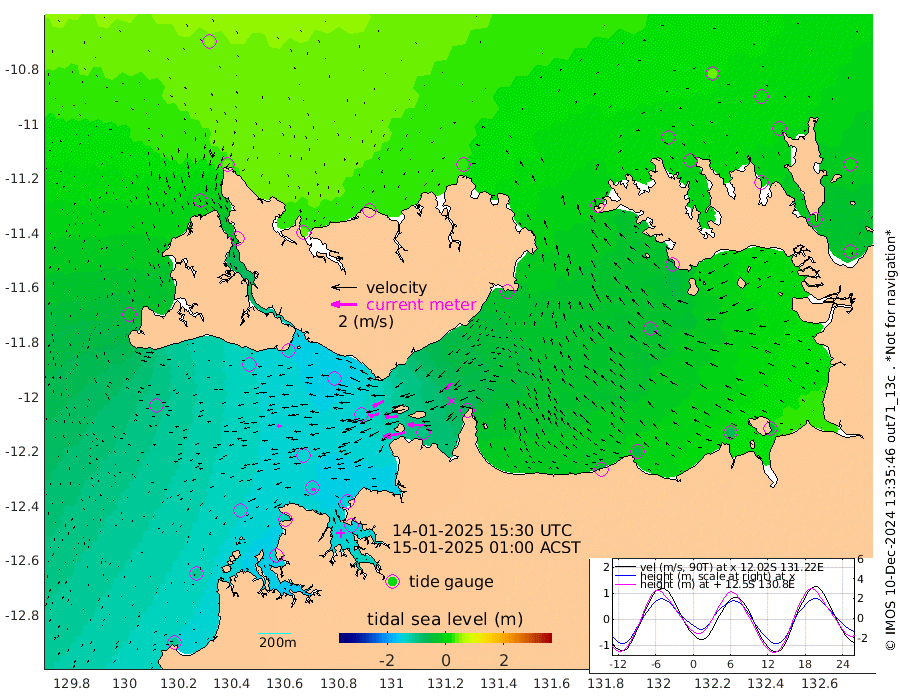 171cm/s -101T +4cm/s rms + 6cm/s 51T. Darwin_C1 52m 129cm/s -90T +4cm/s rms + 7cm/s -161T. Darwin_CW1 22m 75cm/s -107T +4cm/s rms + 8cm/s 61T. Darwin_CW2 34m 74cm/s -134T +3cm/s rms + 9cm/s 98T. Darwin_CW3 22m 100cm/s -91T +5cm/s rms + 7cm/s 88T. Darwin_C3 56m 94cm/s -116T +2cm/s rms + 9cm/s -126T. Darwin_CTbW 22m 35cm/s -93T +1cm/s rms + 1cm/s -47T. DARBGF 30m 34cm/s -69T +4cm/s rms + 3cm/s 80T. NRSDAR 19m 47cm Goodrich Bank -112cm Point Jenny -109cm Native Point -130cm Fish Reef -131cm Tapa Bay -34cm Point Fawcett (Offshore) -143cm Burge Point -140cm Munkunuwa -92cm Beagle A -148cm Parsons Bank -140cm Fenton Patches -139cm Hancox Shoal Area -146cm Nightcliff -154cm Darwin -130cm Charles Point Patches -97cm Glyde Point -54cm Chambers Bay -54cm Point Stuart -77cm Cape Hotham -45cm Christine Reef -58cm West Alligator Head -38cm East Field Island -49cm Two Hills Bay -39cm Camp Point -130cm Medina Inlet South -23cm South Barlow Point 4cm St. Asaph Bay 41cm Cape Van Dieman 39cm Snake Bay 40cm Cache Point 23cm Point Jahleel (Off) -14cm Cape Don 14cm Port Essington 10cm Smith Point - West 17cm NW Peacock Island 35cm North Of Jones Shoal 10cm Peacock Island 0cm Point David 8cm D'urville Point -5cm Copeland Island 5cm One Tree Point