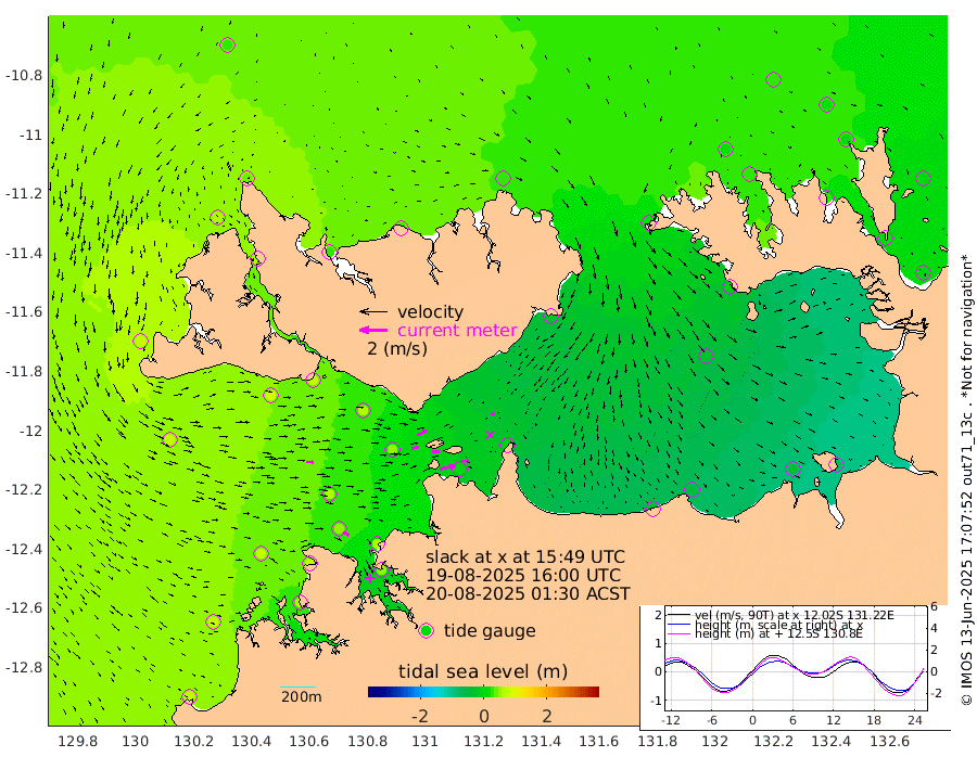 114cm/s 78T +4cm/s rms + 6cm/s 51T. Darwin_C1 52m 56cm/s 92T +4cm/s rms + 7cm/s -161T. Darwin_CW1 22m 48cm/s 73T +4cm/s rms + 8cm/s 61T. Darwin_CW2 34m 27cm/s 68T +3cm/s rms + 9cm/s 98T. Darwin_CW3 22m 51cm/s 87T +5cm/s rms + 7cm/s 88T. Darwin_C3 56m 76cm/s 65T +2cm/s rms + 9cm/s -126T. Darwin_CTbW 22m 50cm/s 92T +1cm/s rms + 1cm/s -47T. DARBGF 30m 49cm/s 120T +4cm/s rms + 3cm/s 80T. NRSDAR 19m 29cm Goodrich Bank 75cm Point Jenny 74cm Native Point 75cm Fish Reef 70cm Tapa Bay 73cm Point Fawcett (Offshore) 60cm Burge Point 84cm Munkunuwa 68cm Beagle A 61cm Parsons Bank 58cm Fenton Patches 49cm Hancox Shoal Area 61cm Nightcliff 49cm Darwin 52cm Charles Point Patches 11cm Glyde Point -31cm Chambers Bay -38cm Point Stuart -2cm Cape Hotham -24cm Christine Reef -42cm West Alligator Head -71cm East Field Island -11cm Two Hills Bay -29cm Camp Point 70cm Medina Inlet South 60cm South Barlow Point 57cm St. Asaph Bay 35cm Cape Van Dieman 33cm Snake Bay 34cm Cache Point 29cm Point Jahleel (Off) 20cm Cape Don 22cm Port Essington 30cm Smith Point - West 20cm NW Peacock Island 25cm North Of Jones Shoal 8cm Peacock Island 1cm Point David 23cm D'urville Point -1cm Copeland Island 6cm One Tree Point