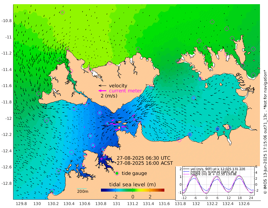 150cm/s -100T +4cm/s rms + 6cm/s 51T. Darwin_C1 52m 125cm/s -92T +4cm/s rms + 7cm/s -161T. Darwin_CW1 22m 73cm/s -105T +4cm/s rms + 8cm/s 61T. Darwin_CW2 34m 93cm/s -137T +3cm/s rms + 9cm/s 98T. Darwin_CW3 22m 146cm/s -91T +5cm/s rms + 7cm/s 88T. Darwin_C3 56m 74cm/s -116T +2cm/s rms + 9cm/s -126T. Darwin_CTbW 22m 17cm/s 123T +1cm/s rms + 1cm/s -47T. DARBGF 30m 28cm/s 144T +4cm/s rms + 3cm/s 80T. NRSDAR 19m 43cm Goodrich Bank -123cm Point Jenny -118cm Native Point -151cm Fish Reef -151cm Tapa Bay -36cm Point Fawcett (Offshore) -178cm Burge Point -137cm Munkunuwa -97cm Beagle A -183cm Parsons Bank -166cm Fenton Patches -186cm Hancox Shoal Area -189cm Nightcliff -215cm Darwin -177cm Charles Point Patches -186cm Glyde Point -197cm Chambers Bay -208cm Point Stuart -180cm Cape Hotham -175cm Christine Reef -229cm West Alligator Head -236cm East Field Island -169cm Two Hills Bay -152cm Camp Point -158cm Medina Inlet South -19cm South Barlow Point 10cm St. Asaph Bay 43cm Cape Van Dieman 32cm Snake Bay 30cm Cache Point 2cm Point Jahleel (Off) -65cm Cape Don -11cm Port Essington -10cm Smith Point - West -9cm NW Peacock Island 7cm North Of Jones Shoal 0cm Peacock Island -38cm Point David -14cm D'urville Point -43cm Copeland Island -41cm One Tree Point