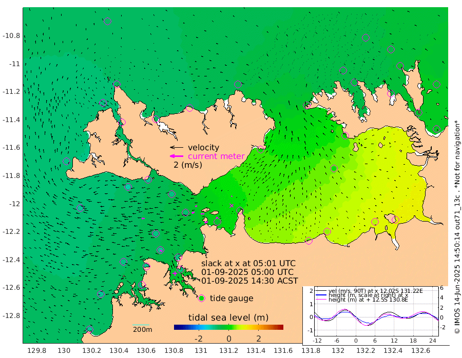 53cm/s -102T +4cm/s rms + 6cm/s 51T. Darwin_C1 52m 29cm/s -85T +4cm/s rms + 7cm/s -161T. Darwin_CW1 22m 43cm/s -107T +4cm/s rms + 8cm/s 61T. Darwin_CW2 34m 12cm/s -108T +3cm/s rms + 9cm/s 98T. Darwin_CW3 22m 51cm/s -93T +5cm/s rms + 7cm/s 88T. Darwin_C3 56m 29cm/s -116T +2cm/s rms + 9cm/s -126T. Darwin_CTbW 22m 41cm/s -90T +1cm/s rms + 1cm/s -47T. DARBGF 30m 40cm/s -59T +4cm/s rms + 3cm/s 80T. NRSDAR 19m -73cm Goodrich Bank -104cm Point Jenny -107cm Native Point -96cm Fish Reef -108cm Tapa Bay -96cm Point Fawcett (Offshore) -104cm Burge Point -114cm Munkunuwa -104cm Beagle A -96cm Parsons Bank -101cm Fenton Patches -86cm Hancox Shoal Area -92cm Nightcliff -94cm Darwin -106cm Charles Point Patches -32cm Glyde Point 34cm Chambers Bay 55cm Point Stuart -4cm Cape Hotham 20cm Christine Reef 66cm West Alligator Head 93cm East Field Island 20cm Two Hills Bay 9cm Camp Point -104cm Medina Inlet South -99cm South Barlow Point -93cm St. Asaph Bay -75cm Cape Van Dieman -74cm Snake Bay -67cm Cache Point -58cm Point Jahleel (Off) -35cm Cape Don -49cm Port Essington -53cm Smith Point - West -47cm NW Peacock Island -47cm North Of Jones Shoal -15cm Peacock Island -23cm Point David -47cm D'urville Point -18cm Copeland Island -23cm One Tree Point