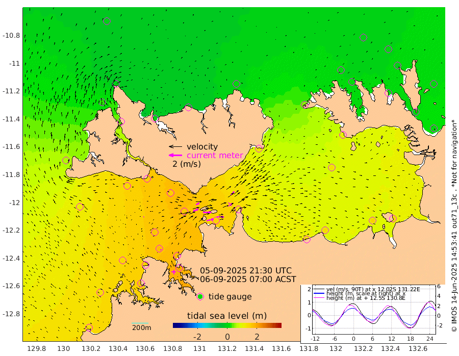 109cm/s 79T +4cm/s rms + 6cm/s 51T. Darwin_C1 52m 105cm/s 92T +4cm/s rms + 7cm/s -161T. Darwin_CW1 22m 79cm/s 71T +4cm/s rms + 8cm/s 61T. Darwin_CW2 34m 74cm/s 45T +3cm/s rms + 9cm/s 98T. Darwin_CW3 22m 125cm/s 90T +5cm/s rms + 7cm/s 88T. Darwin_C3 56m 56cm/s 66T +2cm/s rms + 9cm/s -126T. Darwin_CTbW 22m 8cm/s 4T +1cm/s rms + 1cm/s -47T. DARBGF 30m 15cm/s -34T +4cm/s rms + 3cm/s 80T. NRSDAR 19m -9cm Goodrich Bank 132cm Point Jenny 131cm Native Point 143cm Fish Reef 153cm Tapa Bay 57cm Point Fawcett (Offshore) 173cm Burge Point 136cm Munkunuwa 113cm Beagle A 156cm Parsons Bank 165cm Fenton Patches 163cm Hancox Shoal Area 177cm Nightcliff 192cm Darwin 173cm Charles Point Patches 152cm Glyde Point 148cm Chambers Bay 137cm Point Stuart 130cm Cape Hotham 132cm Christine Reef 150cm West Alligator Head 156cm East Field Island 111cm Two Hills Bay 124cm Camp Point 154cm Medina Inlet South 42cm South Barlow Point 23cm St. Asaph Bay -11cm Cape Van Dieman -7cm Snake Bay -6cm Cache Point 9cm Point Jahleel (Off) 51cm Cape Don 9cm Port Essington 5cm Smith Point - West 0cm NW Peacock Island -3cm North Of Jones Shoal -1cm Peacock Island 5cm Point David 1cm D'urville Point 7cm Copeland Island 11cm One Tree Point