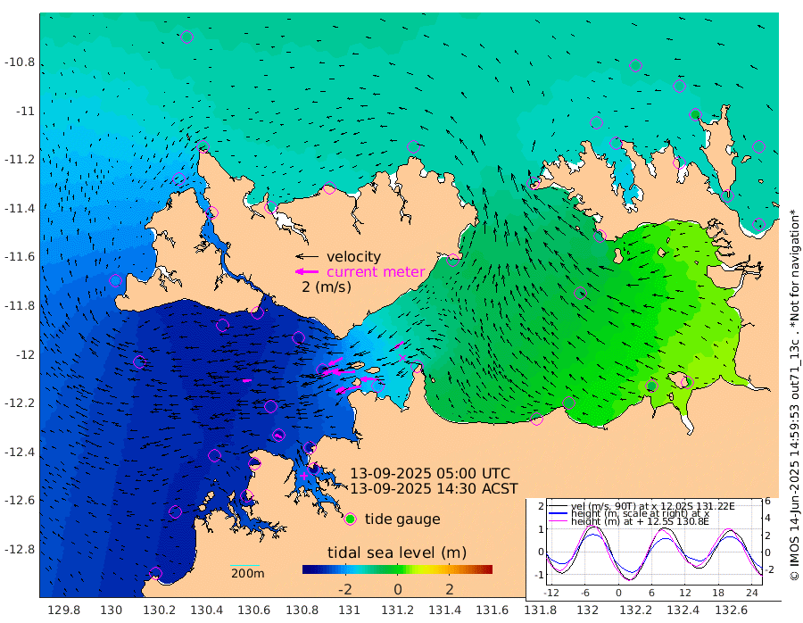 229cm/s -102T +4cm/s rms + 6cm/s 51T. Darwin_C1 52m 162cm/s -90T +4cm/s rms + 7cm/s -161T. Darwin_CW1 22m 141cm/s -107T +4cm/s rms + 8cm/s 61T. Darwin_CW2 34m 90cm/s -128T +3cm/s rms + 9cm/s 98T. Darwin_CW3 22m 190cm/s -91T +5cm/s rms + 7cm/s 88T. Darwin_C3 56m 132cm/s -115T +2cm/s rms + 9cm/s -126T. Darwin_CTbW 22m 79cm/s -93T +1cm/s rms + 1cm/s -47T. DARBGF 30m 63cm/s -65T +4cm/s rms + 3cm/s 80T. NRSDAR 19m -97cm Goodrich Bank -273cm Point Jenny -273cm Native Point -286cm Fish Reef -295cm Tapa Bay -208cm Point Fawcett (Offshore) -304cm Burge Point -291cm Munkunuwa -253cm Beagle A -298cm Parsons Bank -289cm Fenton Patches -278cm Hancox Shoal Area -293cm Nightcliff -315cm Darwin -311cm Charles Point Patches -189cm Glyde Point -78cm Chambers Bay -55cm Point Stuart -140cm Cape Hotham -79cm Christine Reef -46cm West Alligator Head 2cm East Field Island -94cm Two Hills Bay -92cm Camp Point -297cm Medina Inlet South -193cm South Barlow Point -158cm St. Asaph Bay -106cm Cape Van Dieman -114cm Snake Bay -106cm Cache Point -108cm Point Jahleel (Off) -128cm Cape Don -117cm Port Essington -120cm Smith Point - West -110cm NW Peacock Island -101cm North Of Jones Shoal -36cm Peacock Island -106cm Point David -119cm D'urville Point -103cm Copeland Island -109cm One Tree Point