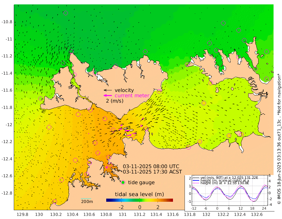 105cm/s 79T +4cm/s rms + 6cm/s 51T. Darwin_C1 52m 85cm/s 93T +4cm/s rms + 7cm/s -161T. Darwin_CW1 22m 75cm/s 72T +4cm/s rms + 8cm/s 61T. Darwin_CW2 34m 67cm/s 42T +3cm/s rms + 9cm/s 98T. Darwin_CW3 22m 119cm/s 89T +5cm/s rms + 7cm/s 88T. Darwin_C3 56m 50cm/s 66T +2cm/s rms + 9cm/s -126T. Darwin_CTbW 22m 12cm/s 57T +1cm/s rms + 1cm/s -47T. DARBGF 30m 6cm/s 52T +4cm/s rms + 3cm/s 80T. NRSDAR 19m -25cm Goodrich Bank 148cm Point Jenny 145cm Native Point 153cm Fish Reef 173cm Tapa Bay 54cm Point Fawcett (Offshore) 183cm Burge Point 147cm Munkunuwa 123cm Beagle A 177cm Parsons Bank 181cm Fenton Patches 190cm Hancox Shoal Area 199cm Nightcliff 202cm Darwin 180cm Charles Point Patches 159cm Glyde Point 151cm Chambers Bay 139cm Point Stuart 141cm Cape Hotham 137cm Christine Reef 150cm West Alligator Head 148cm East Field Island 115cm Two Hills Bay 122cm Camp Point 158cm Medina Inlet South 35cm South Barlow Point 14cm St. Asaph Bay -23cm Cape Van Dieman -21cm Snake Bay -16cm Cache Point 4cm Point Jahleel (Off) 50cm Cape Don 9cm Port Essington 11cm Smith Point - West 8cm NW Peacock Island -8cm North Of Jones Shoal -1cm Peacock Island 32cm Point David 14cm D'urville Point 37cm Copeland Island 26cm One Tree Point