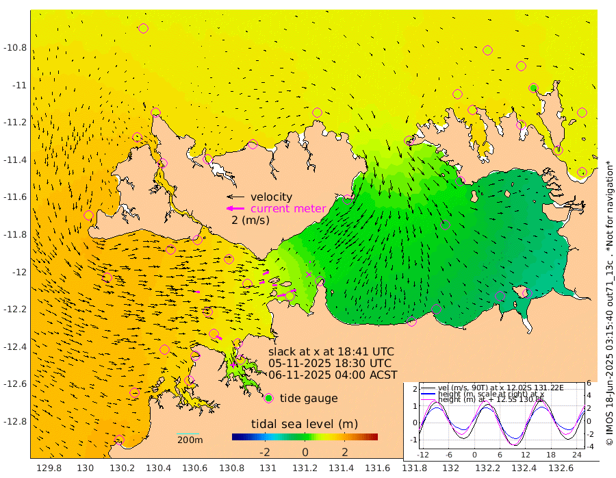 93cm/s 78T +4cm/s rms + 6cm/s 51T. Darwin_C1 52m 60cm/s 83T +4cm/s rms + 7cm/s -161T. Darwin_CW1 22m 57cm/s 75T +4cm/s rms + 8cm/s 61T. Darwin_CW2 34m 10cm/s 99T +3cm/s rms + 9cm/s 98T. Darwin_CW3 22m 55cm/s 86T +5cm/s rms + 7cm/s 88T. Darwin_C3 56m 73cm/s 62T +2cm/s rms + 9cm/s -126T. Darwin_CTbW 22m 73cm/s 92T +1cm/s rms + 1cm/s -47T. DARBGF 30m 73cm/s 123T +4cm/s rms + 3cm/s 80T. NRSDAR 19m 89cm Goodrich Bank 160cm Point Jenny 164cm Native Point 167cm Fish Reef 163cm Tapa Bay 143cm Point Fawcett (Offshore) 166cm Burge Point 168cm Munkunuwa 166cm Beagle A 158cm Parsons Bank 165cm Fenton Patches 132cm Hancox Shoal Area 147cm Nightcliff 155cm Darwin 162cm Charles Point Patches 69cm Glyde Point -35cm Chambers Bay -49cm Point Stuart 34cm Cape Hotham -29cm Christine Reef -69cm West Alligator Head -110cm East Field Island 0cm Two Hills Bay 3cm Camp Point 165cm Medina Inlet South 144cm South Barlow Point 122cm St. Asaph Bay 99cm Cape Van Dieman 105cm Snake Bay 92cm Cache Point 83cm Point Jahleel (Off) 72cm Cape Don 88cm Port Essington 90cm Smith Point - West 86cm NW Peacock Island 77cm North Of Jones Shoal 28cm Peacock Island 81cm Point David 93cm D'urville Point 75cm Copeland Island 78cm One Tree Point