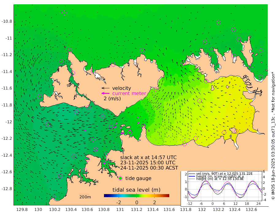 94cm/s -103T +4cm/s rms + 6cm/s 51T. Darwin_C1 52m 42cm/s -87T +4cm/s rms + 7cm/s -161T. Darwin_CW1 22m 56cm/s -112T +4cm/s rms + 8cm/s 61T. Darwin_CW2 34m 27cm/s -109T +3cm/s rms + 9cm/s 98T. Darwin_CW3 22m 42cm/s -95T +5cm/s rms + 7cm/s 88T. Darwin_C3 56m 56cm/s -117T +2cm/s rms + 9cm/s -126T. Darwin_CTbW 22m 46cm/s -89T +1cm/s rms + 1cm/s -47T. DARBGF 30m 41cm/s -60T +4cm/s rms + 3cm/s 80T. NRSDAR 19m 7cm Goodrich Bank -58cm Point Jenny -58cm Native Point -55cm Fish Reef -64cm Tapa Bay -29cm Point Fawcett (Offshore) -63cm Burge Point -85cm Munkunuwa -48cm Beagle A -75cm Parsons Bank -59cm Fenton Patches -59cm Hancox Shoal Area -70cm Nightcliff -60cm Darwin -55cm Charles Point Patches 4cm Glyde Point 72cm Chambers Bay 88cm Point Stuart 26cm Cape Hotham 61cm Christine Reef 102cm West Alligator Head 137cm East Field Island 54cm Two Hills Bay 51cm Camp Point -64cm Medina Inlet South -40cm South Barlow Point -20cm St. Asaph Bay -1cm Cape Van Dieman -5cm Snake Bay 9cm Cache Point 6cm Point Jahleel (Off) 6cm Cape Don -2cm Port Essington -8cm Smith Point - West -4cm NW Peacock Island 3cm North Of Jones Shoal -1cm Peacock Island -12cm Point David -12cm D'urville Point -13cm Copeland Island -6cm One Tree Point