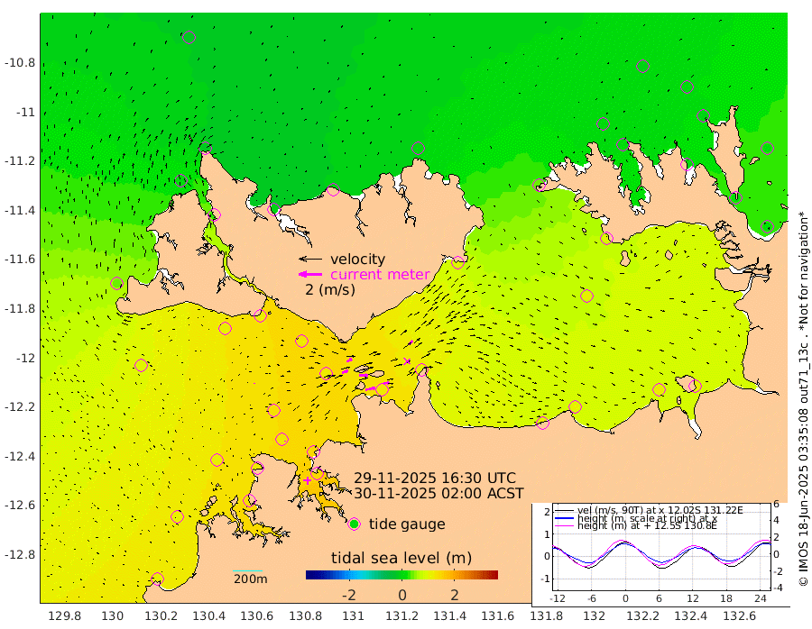 84cm/s 78T +4cm/s rms + 6cm/s 51T. Darwin_C1 52m 51cm/s 90T +4cm/s rms + 7cm/s -161T. Darwin_CW1 22m 54cm/s 72T +4cm/s rms + 8cm/s 61T. Darwin_CW2 34m 49cm/s 48T +3cm/s rms + 9cm/s 98T. Darwin_CW3 22m 80cm/s 89T +5cm/s rms + 7cm/s 88T. Darwin_C3 56m 49cm/s 65T +2cm/s rms + 9cm/s -126T. Darwin_CTbW 22m 6cm/s 36T +1cm/s rms + 1cm/s -47T. DARBGF 30m 7cm/s -4T +4cm/s rms + 3cm/s 80T. NRSDAR 19m -14cm Goodrich Bank 104cm Point Jenny 104cm Native Point 106cm Fish Reef 115cm Tapa Bay 38cm Point Fawcett (Offshore) 132cm Burge Point 102cm Munkunuwa 90cm Beagle A 121cm Parsons Bank 128cm Fenton Patches 122cm Hancox Shoal Area 139cm Nightcliff 137cm Darwin 115cm Charles Point Patches 114cm Glyde Point 114cm Chambers Bay 109cm Point Stuart 101cm Cape Hotham 108cm Christine Reef 120cm West Alligator Head 121cm East Field Island 91cm Two Hills Bay 93cm Camp Point 111cm Medina Inlet South 29cm South Barlow Point 10cm St. Asaph Bay -12cm Cape Van Dieman -7cm Snake Bay -8cm Cache Point 6cm Point Jahleel (Off) 42cm Cape Don 5cm Port Essington 5cm Smith Point - West 3cm NW Peacock Island -6cm North Of Jones Shoal -1cm Peacock Island 15cm Point David 6cm D'urville Point 16cm Copeland Island 15cm One Tree Point