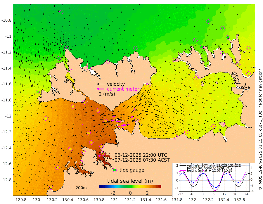 192cm/s 78T +4cm/s rms + 6cm/s 51T. Darwin_C1 52m 140cm/s 91T +4cm/s rms + 7cm/s -161T. Darwin_CW1 22m 82cm/s 73T +4cm/s rms + 8cm/s 61T. Darwin_CW2 34m 113cm/s 43T +3cm/s rms + 9cm/s 98T. Darwin_CW3 22m 130cm/s 89T +5cm/s rms + 7cm/s 88T. Darwin_C3 56m 93cm/s 65T +2cm/s rms + 9cm/s -126T. Darwin_CTbW 22m 11cm/s 62T +1cm/s rms + 1cm/s -47T. DARBGF 30m 10cm/s 61T +4cm/s rms + 3cm/s 80T. NRSDAR 19m -39cm Goodrich Bank 137cm Point Jenny 135cm Native Point 156cm Fish Reef 168cm Tapa Bay 37cm Point Fawcett (Offshore) 188cm Burge Point 156cm Munkunuwa 105cm Beagle A 202cm Parsons Bank 175cm Fenton Patches 196cm Hancox Shoal Area 189cm Nightcliff 221cm Darwin 188cm Charles Point Patches 168cm Glyde Point 131cm Chambers Bay 143cm Point Stuart 149cm Cape Hotham 119cm Christine Reef 150cm West Alligator Head 138cm East Field Island 124cm Two Hills Bay 118cm Camp Point 165cm Medina Inlet South 32cm South Barlow Point -7cm St. Asaph Bay -33cm Cape Van Dieman -22cm Snake Bay -29cm Cache Point -2cm Point Jahleel (Off) 63cm Cape Don 26cm Port Essington 22cm Smith Point - West 26cm NW Peacock Island -8cm North Of Jones Shoal 2cm Peacock Island 78cm Point David 37cm D'urville Point 83cm Copeland Island 66cm One Tree Point