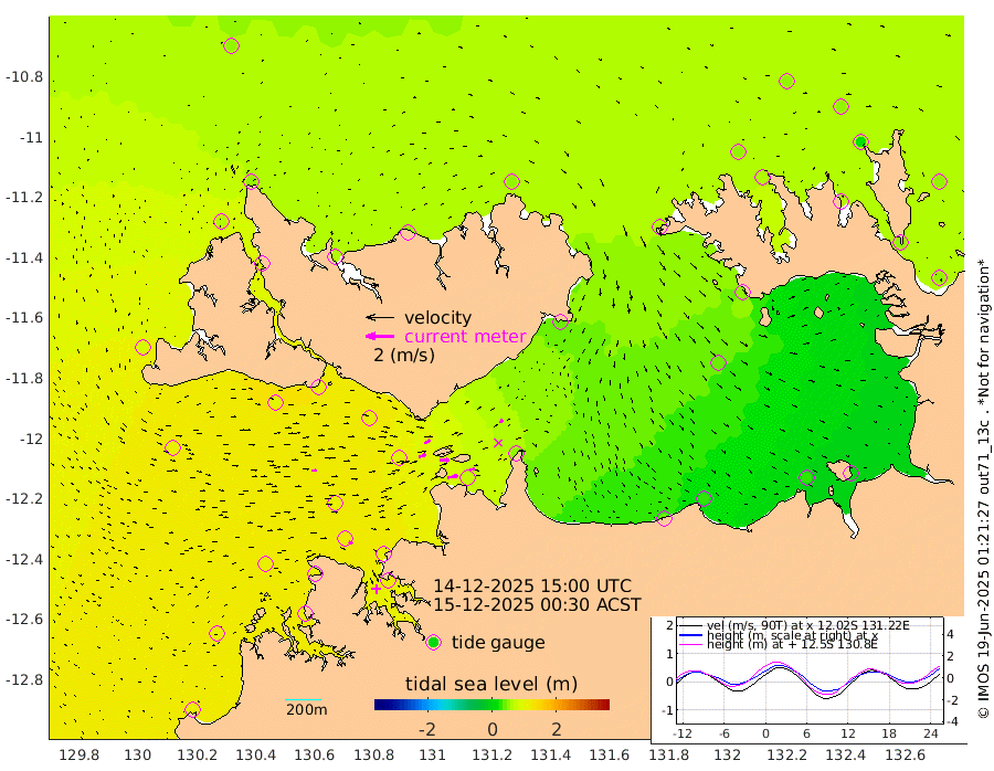 73cm/s 78T +4cm/s rms + 6cm/s 51T. Darwin_C1 52m 40cm/s 90T +4cm/s rms + 7cm/s -161T. Darwin_CW1 22m 51cm/s 74T +4cm/s rms + 8cm/s 61T. Darwin_CW2 34m 29cm/s 51T +3cm/s rms + 9cm/s 98T. Darwin_CW3 22m 72cm/s 89T +5cm/s rms + 7cm/s 88T. Darwin_C3 56m 47cm/s 65T +2cm/s rms + 9cm/s -126T. Darwin_CTbW 22m 31cm/s 88T +1cm/s rms + 1cm/s -47T. DARBGF 30m 28cm/s 116T +4cm/s rms + 3cm/s 80T. NRSDAR 19m 46cm Goodrich Bank 101cm Point Jenny 102cm Native Point 109cm Fish Reef 105cm Tapa Bay 82cm Point Fawcett (Offshore) 109cm Burge Point 99cm Munkunuwa 102cm Beagle A 107cm Parsons Bank 111cm Fenton Patches 98cm Hancox Shoal Area 111cm Nightcliff 116cm Darwin 113cm Charles Point Patches 74cm Glyde Point 40cm Chambers Bay 28cm Point Stuart 56cm Cape Hotham 37cm Christine Reef 25cm West Alligator Head 9cm East Field Island 45cm Two Hills Bay 40cm Camp Point 111cm Medina Inlet South 81cm South Barlow Point 65cm St. Asaph Bay 49cm Cape Van Dieman 56cm Snake Bay 50cm Cache Point 50cm Point Jahleel (Off) 60cm Cape Don 55cm Port Essington 57cm Smith Point - West 54cm NW Peacock Island 51cm North Of Jones Shoal 18cm Peacock Island 49cm Point David 58cm D'urville Point 47cm Copeland Island 54cm One Tree Point