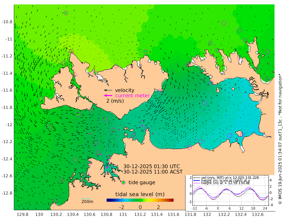 7cm/s 72T +4cm/s rms + 6cm/s 51T. Darwin_C1 52m 16cm/s -97T +4cm/s rms + 7cm/s -161T. Darwin_CW1 22m 15cm/s 71T +4cm/s rms + 8cm/s 61T. Darwin_CW2 34m 23cm/s -155T +3cm/s rms + 9cm/s 98T. Darwin_CW3 22m 3cm/s -17T +5cm/s rms + 7cm/s 88T. Darwin_C3 56m 11cm/s 64T +2cm/s rms + 9cm/s -126T. Darwin_CTbW 22m 43cm/s 96T +1cm/s rms + 1cm/s -47T. DARBGF 30m 46cm/s 123T +4cm/s rms + 3cm/s 80T. NRSDAR 19m 31cm Goodrich Bank -6cm Point Jenny -6cm Native Point -11cm Fish Reef -15cm Tapa Bay 30cm Point Fawcett (Offshore) -31cm Burge Point 12cm Munkunuwa -9cm Beagle A -17cm Parsons Bank -38cm Fenton Patches -36cm Hancox Shoal Area -40cm Nightcliff -43cm Darwin -26cm Charles Point Patches -76cm Glyde Point -119cm Chambers Bay -133cm Point Stuart -85cm Cape Hotham -111cm Christine Reef -150cm West Alligator Head -182cm East Field Island -90cm Two Hills Bay -99cm Camp Point -10cm Medina Inlet South 36cm South Barlow Point 37cm St. Asaph Bay 37cm Cape Van Dieman 33cm Snake Bay 28cm Cache Point 15cm Point Jahleel (Off) -12cm Cape Don 19cm Port Essington 22cm Smith Point - West 17cm NW Peacock Island 24cm North Of Jones Shoal 8cm Peacock Island 1cm Point David 20cm D'urville Point -1cm Copeland Island 3cm One Tree Point