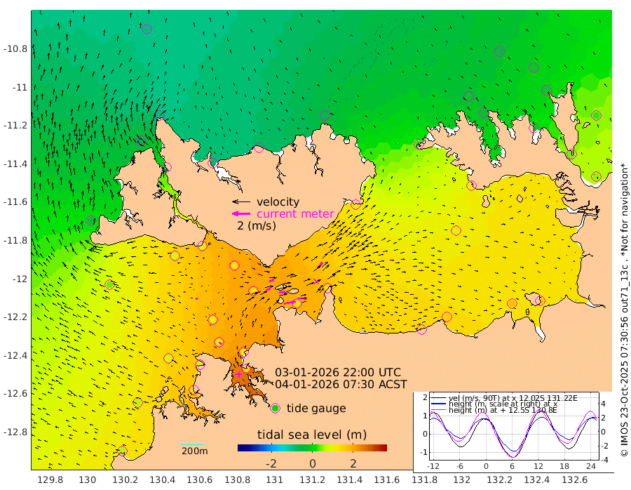 126cm/s 79T +4cm/s rms + 6cm/s 51T. Darwin_C1 52m 102cm/s 92T +4cm/s rms + 7cm/s -161T. Darwin_CW1 22m 54cm/s 69T +4cm/s rms + 8cm/s 61T. Darwin_CW2 34m 88cm/s 42T +3cm/s rms + 9cm/s 98T. Darwin_CW3 22m 86cm/s 90T +5cm/s rms + 7cm/s 88T. Darwin_C3 56m 57cm/s 64T +2cm/s rms + 9cm/s -126T. Darwin_CTbW 22m 24cm/s -77T +1cm/s rms + 1cm/s -47T. DARBGF 30m 34cm/s -49T +4cm/s rms + 3cm/s 80T. NRSDAR 19m -85cm Goodrich Bank 66cm Point Jenny 64cm Native Point 82cm Fish Reef 94cm Tapa Bay -32cm Point Fawcett (Offshore) 117cm Burge Point 80cm Munkunuwa 37cm Beagle A 130cm Parsons Bank 109cm Fenton Patches 134cm Hancox Shoal Area 123cm Nightcliff 148cm Darwin 111cm Charles Point Patches 133cm Glyde Point 140cm Chambers Bay 157cm Point Stuart 129cm Cape Hotham 124cm Christine Reef 171cm West Alligator Head 179cm East Field Island 115cm Two Hills Bay 113cm Camp Point 88cm Medina Inlet South -36cm South Barlow Point -67cm St. Asaph Bay -82cm Cape Van Dieman -75cm Snake Bay -75cm Cache Point -45cm Point Jahleel (Off) 23cm Cape Don -21cm Port Essington -25cm Smith Point - West -19cm NW Peacock Island -52cm North Of Jones Shoal -14cm Peacock Island 37cm Point David -11cm D'urville Point 45cm Copeland Island 23cm One Tree Point