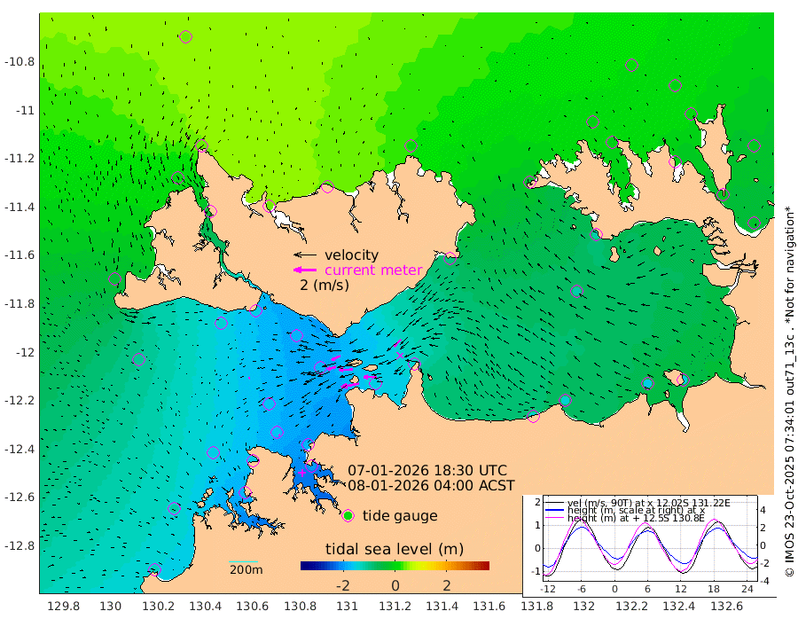 161cm/s -101T +4cm/s rms + 6cm/s 51T. Darwin_C1 52m 113cm/s -91T +4cm/s rms + 7cm/s -161T. Darwin_CW1 22m 77cm/s -106T +4cm/s rms + 8cm/s 61T. Darwin_CW2 34m 86cm/s -136T +3cm/s rms + 9cm/s 98T. Darwin_CW3 22m 122cm/s -91T +5cm/s rms + 7cm/s 88T. Darwin_C3 56m 87cm/s -116T +2cm/s rms + 9cm/s -126T. Darwin_CTbW 22m 13cm/s -115T +1cm/s rms + 1cm/s -47T. DARBGF 30m 11cm/s -113T +4cm/s rms + 3cm/s 80T. NRSDAR 19m 44cm Goodrich Bank -127cm Point Jenny -122cm Native Point -149cm Fish Reef -150cm Tapa Bay -38cm Point Fawcett (Offshore) -170cm Burge Point -146cm Munkunuwa -105cm Beagle A -176cm Parsons Bank -166cm Fenton Patches -173cm Hancox Shoal Area -178cm Nightcliff -192cm Darwin -160cm Charles Point Patches -149cm Glyde Point -139cm Chambers Bay -140cm Point Stuart -137cm Cape Hotham -122cm Christine Reef -154cm West Alligator Head -146cm East Field Island -117cm Two Hills Bay -100cm Camp Point -150cm Medina Inlet South -24cm South Barlow Point 5cm St. Asaph Bay 42cm Cape Van Dieman 36cm Snake Bay 33cm Cache Point 9cm Point Jahleel (Off) -44cm Cape Don -1cm Port Essington -5cm Smith Point - West -1cm NW Peacock Island 20cm North Of Jones Shoal 5cm Peacock Island -21cm Point David -8cm D'urville Point -27cm Copeland Island -19cm One Tree Point