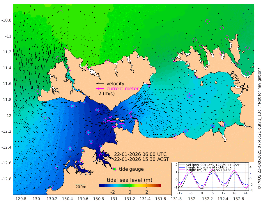 169cm/s -101T +4cm/s rms + 6cm/s 51T. Darwin_C1 52m 123cm/s -91T +4cm/s rms + 7cm/s -161T. Darwin_CW1 22m 88cm/s -106T +4cm/s rms + 8cm/s 61T. Darwin_CW2 34m 99cm/s -136T +3cm/s rms + 9cm/s 98T. Darwin_CW3 22m 149cm/s -90T +5cm/s rms + 7cm/s 88T. Darwin_C3 56m 92cm/s -115T +2cm/s rms + 9cm/s -126T. Darwin_CTbW 22m 9cm/s 161T +1cm/s rms + 1cm/s -47T. DARBGF 30m 18cm/s 161T +4cm/s rms + 3cm/s 80T. NRSDAR 19m 27cm Goodrich Bank -166cm Point Jenny -165cm Native Point -173cm Fish Reef -201cm Tapa Bay -54cm Point Fawcett (Offshore) -218cm Burge Point -174cm Munkunuwa -125cm Beagle A -222cm Parsons Bank -203cm Fenton Patches -230cm Hancox Shoal Area -231cm Nightcliff -256cm Darwin -224cm Charles Point Patches -204cm Glyde Point -199cm Chambers Bay -191cm Point Stuart -180cm Cape Hotham -181cm Christine Reef -206cm West Alligator Head -205cm East Field Island -159cm Two Hills Bay -167cm Camp Point -194cm Medina Inlet South -42cm South Barlow Point -7cm St. Asaph Bay 26cm Cape Van Dieman 16cm Snake Bay 19cm Cache Point -7cm Point Jahleel (Off) -78cm Cape Don -25cm Port Essington -21cm Smith Point - West -22cm NW Peacock Island 2cm North Of Jones Shoal -2cm Peacock Island -61cm Point David -28cm D'urville Point -64cm Copeland Island -55cm One Tree Point