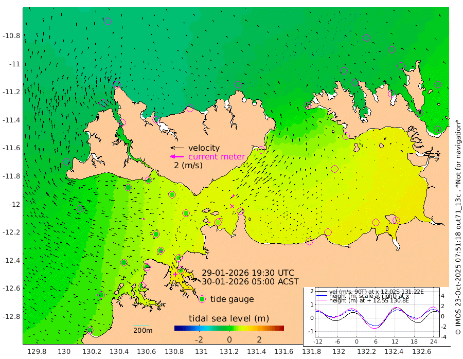 23cm/s 80T +4cm/s rms + 6cm/s 51T. Darwin_C1 52m 31cm/s 92T +4cm/s rms + 7cm/s -161T. Darwin_CW1 22m 2cm/s -20T +4cm/s rms + 8cm/s 61T. Darwin_CW2 34m 34cm/s 34T +3cm/s rms + 9cm/s 98T. Darwin_CW3 22m 8cm/s 99T +5cm/s rms + 7cm/s 88T. Darwin_C3 56m 5cm/s 62T +2cm/s rms + 9cm/s -126T. Darwin_CTbW 22m 32cm/s -86T +1cm/s rms + 1cm/s -47T. DARBGF 30m 33cm/s -56T +4cm/s rms + 3cm/s 80T. NRSDAR 19m -81cm Goodrich Bank -9cm Point Jenny -9cm Native Point -3cm Fish Reef 4cm Tapa Bay -68cm Point Fawcett (Offshore) 20cm Burge Point -9cm Munkunuwa -20cm Beagle A 23cm Parsons Bank 21cm Fenton Patches 31cm Hancox Shoal Area 25cm Nightcliff 32cm Darwin 7cm Charles Point Patches 53cm Glyde Point 80cm Chambers Bay 99cm Point Stuart 60cm Cape Hotham 71cm Christine Reef 110cm West Alligator Head 129cm East Field Island 59cm Two Hills Bay 63cm Camp Point -4cm Medina Inlet South -68cm South Barlow Point -81cm St. Asaph Bay -80cm Cape Van Dieman -78cm Snake Bay -76cm Cache Point -56cm Point Jahleel (Off) -14cm Cape Don -44cm Port Essington -47cm Smith Point - West -40cm NW Peacock Island -63cm North Of Jones Shoal -19cm Peacock Island 0cm Point David -37cm D'urville Point 6cm Copeland Island -12cm One Tree Point