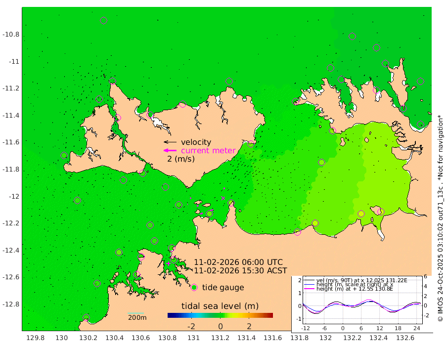 37cm/s 80T +4cm/s rms + 6cm/s 51T. Darwin_C1 52m 52cm/s 92T +4cm/s rms + 7cm/s -161T. Darwin_CW1 22m 6cm/s 88T +4cm/s rms + 8cm/s 61T. Darwin_CW2 34m 23cm/s 38T +3cm/s rms + 9cm/s 98T. Darwin_CW3 22m 25cm/s 93T +5cm/s rms + 7cm/s 88T. Darwin_C3 56m 19cm/s 69T +2cm/s rms + 9cm/s -126T. Darwin_CTbW 22m 1cm/s -37T +1cm/s rms + 1cm/s -47T. DARBGF 30m 3cm/s -61T +4cm/s rms + 3cm/s 80T. NRSDAR 19m 0cm Goodrich Bank 30cm Point Jenny 26cm Native Point 34cm Fish Reef 29cm Tapa Bay 25cm Point Fawcett (Offshore) 24cm Burge Point 14cm Munkunuwa 28cm Beagle A 13cm Parsons Bank 30cm Fenton Patches 24cm Hancox Shoal Area 29cm Nightcliff 24cm Darwin 25cm Charles Point Patches 42cm Glyde Point 64cm Chambers Bay 71cm Point Stuart 47cm Cape Hotham 56cm Christine Reef 81cm West Alligator Head 92cm East Field Island 52cm Two Hills Bay 45cm Camp Point 23cm Medina Inlet South 0cm South Barlow Point 9cm St. Asaph Bay -1cm Cape Van Dieman -6cm Snake Bay 7cm Cache Point 8cm Point Jahleel (Off) 15cm Cape Don -1cm Port Essington 0cm Smith Point - West -4cm NW Peacock Island 2cm North Of Jones Shoal 0cm Peacock Island -10cm Point David -6cm D'urville Point -10cm Copeland Island -6cm One Tree Point