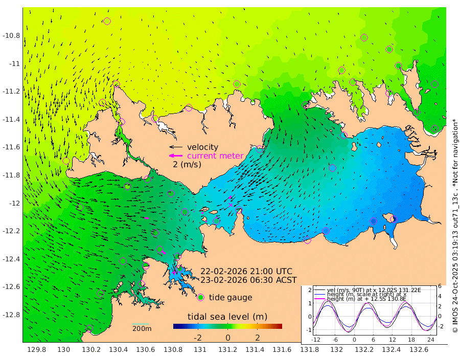 26cm/s -101T +4cm/s rms + 6cm/s 51T. Darwin_C1 52m 21cm/s -94T +4cm/s rms + 7cm/s -161T. Darwin_CW1 22m 10cm/s 67T +4cm/s rms + 8cm/s 61T. Darwin_CW2 34m 56cm/s -143T +3cm/s rms + 9cm/s 98T. Darwin_CW3 22m 26cm/s -84T +5cm/s rms + 7cm/s 88T. Darwin_C3 56m 6cm/s -114T +2cm/s rms + 9cm/s -126T. Darwin_CTbW 22m 68cm/s 96T +1cm/s rms + 1cm/s -47T. DARBGF 30m 76cm/s 126T +4cm/s rms + 3cm/s 80T. NRSDAR 19m 71cm Goodrich Bank 15cm Point Jenny 18cm Native Point 11cm Fish Reef 1cm Tapa Bay 70cm Point Fawcett (Offshore) -14cm Burge Point 35cm Munkunuwa 27cm Beagle A -17cm Parsons Bank -19cm Fenton Patches -44cm Hancox Shoal Area -36cm Nightcliff -40cm Darwin -10cm Charles Point Patches -101cm Glyde Point -186cm Chambers Bay -207cm Point Stuart -122cm Cape Hotham -171cm Christine Reef -236cm West Alligator Head -278cm East Field Island -142cm Two Hills Bay -134cm Camp Point 11cm Medina Inlet South 79cm South Barlow Point 83cm St. Asaph Bay 78cm Cape Van Dieman 73cm Snake Bay 62cm Cache Point 37cm Point Jahleel (Off) -15cm Cape Don 35cm Port Essington 34cm Smith Point - West 27cm NW Peacock Island 44cm North Of Jones Shoal 14cm Peacock Island -6cm Point David 28cm D'urville Point -12cm Copeland Island -1cm One Tree Point