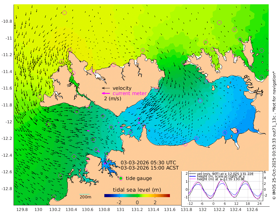 7cm/s 79T +4cm/s rms + 6cm/s 51T. Darwin_C1 52m 15cm/s -88T +4cm/s rms + 7cm/s -161T. Darwin_CW1 22m 11cm/s -108T +4cm/s rms + 8cm/s 61T. Darwin_CW2 34m 47cm/s -147T +3cm/s rms + 9cm/s 98T. Darwin_CW3 22m 55cm/s -89T +5cm/s rms + 7cm/s 88T. Darwin_C3 56m 26cm/s 61T +2cm/s rms + 9cm/s -126T. Darwin_CTbW 22m 65cm/s 98T +1cm/s rms + 1cm/s -47T. DARBGF 30m 72cm/s 127T +4cm/s rms + 3cm/s 80T. NRSDAR 19m 80cm Goodrich Bank 2cm Point Jenny 5cm Native Point -6cm Fish Reef -22cm Tapa Bay 66cm Point Fawcett (Offshore) -45cm Burge Point -3cm Munkunuwa 31cm Beagle A -51cm Parsons Bank -28cm Fenton Patches -67cm Hancox Shoal Area -50cm Nightcliff -76cm Darwin -45cm Charles Point Patches -103cm Glyde Point -167cm Chambers Bay -184cm Point Stuart -117cm Cape Hotham -147cm Christine Reef -207cm West Alligator Head -238cm East Field Island -123cm Two Hills Bay -126cm Camp Point -19cm Medina Inlet South 73cm South Barlow Point 85cm St. Asaph Bay 85cm Cape Van Dieman 80cm Snake Bay 75cm Cache Point 49cm Point Jahleel (Off) -10cm Cape Don 36cm Port Essington 45cm Smith Point - West 37cm NW Peacock Island 53cm North Of Jones Shoal 16cm Peacock Island -7cm Point David 37cm D'urville Point -13cm Copeland Island -1cm One Tree Point