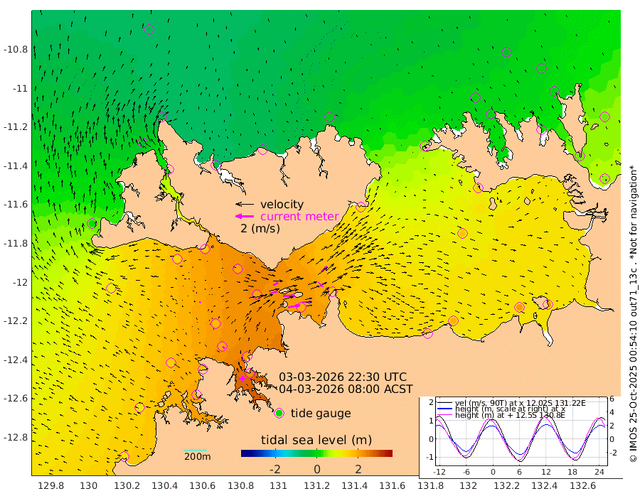 129cm/s 80T +4cm/s rms + 6cm/s 51T. Darwin_C1 52m 102cm/s 92T +4cm/s rms + 7cm/s -161T. Darwin_CW1 22m 85cm/s 70T +4cm/s rms + 8cm/s 61T. Darwin_CW2 34m 83cm/s 44T +3cm/s rms + 9cm/s 98T. Darwin_CW3 22m 132cm/s 89T +5cm/s rms + 7cm/s 88T. Darwin_C3 56m 60cm/s 65T +2cm/s rms + 9cm/s -126T. Darwin_CTbW 22m 14cm/s -52T +1cm/s rms + 1cm/s -47T. DARBGF 30m 30cm/s -45T +4cm/s rms + 3cm/s 80T. NRSDAR 19m -63cm Goodrich Bank 127cm Point Jenny 123cm Native Point 150cm Fish Reef 159cm Tapa Bay 22cm Point Fawcett (Offshore) 187cm Burge Point 146cm Munkunuwa 93cm Beagle A 193cm Parsons Bank 171cm Fenton Patches 196cm Hancox Shoal Area 192cm Nightcliff 220cm Darwin 183cm Charles Point Patches 181cm Glyde Point 182cm Chambers Bay 190cm Point Stuart 173cm Cape Hotham 160cm Christine Reef 207cm West Alligator Head 209cm East Field Island 150cm Two Hills Bay 144cm Camp Point 158cm Medina Inlet South 5cm South Barlow Point -27cm St. Asaph Bay -60cm Cape Van Dieman -53cm Snake Bay -50cm Cache Point -20cm Point Jahleel (Off) 52cm Cape Don 0cm Port Essington -4cm Smith Point - West -3cm NW Peacock Island -27cm North Of Jones Shoal -6cm Peacock Island 42cm Point David 4cm D'urville Point 49cm Copeland Island 36cm One Tree Point