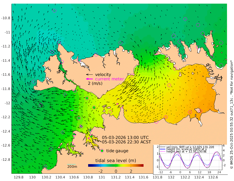 4cm/s -110T +4cm/s rms + 6cm/s 51T. Darwin_C1 52m 6cm/s 77T +4cm/s rms + 7cm/s -161T. Darwin_CW1 22m 2cm/s -118T +4cm/s rms + 8cm/s 61T. Darwin_CW2 34m 31cm/s 35T +3cm/s rms + 9cm/s 98T. Darwin_CW3 22m 29cm/s 97T +5cm/s rms + 7cm/s 88T. Darwin_C3 56m 10cm/s -120T +2cm/s rms + 9cm/s -126T. Darwin_CTbW 22m 72cm/s -84T +1cm/s rms + 1cm/s -47T. DARBGF 30m 81cm/s -53T +4cm/s rms + 3cm/s 80T. NRSDAR 19m -97cm Goodrich Bank -47cm Point Jenny -49cm Native Point -36cm Fish Reef -30cm Tapa Bay -103cm Point Fawcett (Offshore) -7cm Burge Point -41cm Munkunuwa -67cm Beagle A 0cm Parsons Bank -15cm Fenton Patches 15cm Hancox Shoal Area -6cm Nightcliff 21cm Darwin -14cm Charles Point Patches 74cm Glyde Point 152cm Chambers Bay 181cm Point Stuart 92cm Cape Hotham 135cm Christine Reef 210cm West Alligator Head 248cm East Field Island 112cm Two Hills Bay 105cm Camp Point -29cm Medina Inlet South -105cm South Barlow Point -113cm St. Asaph Bay -105cm Cape Van Dieman -102cm Snake Bay -95cm Cache Point -69cm Point Jahleel (Off) -15cm Cape Don -63cm Port Essington -69cm Smith Point - West -63cm NW Peacock Island -81cm North Of Jones Shoal -27cm Peacock Island -31cm Point David -65cm D'urville Point -26cm Copeland Island -35cm One Tree Point