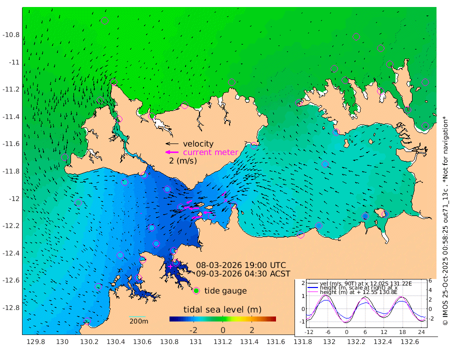 169cm/s -101T +4cm/s rms + 6cm/s 51T. Darwin_C1 52m 138cm/s -91T +4cm/s rms + 7cm/s -161T. Darwin_CW1 22m 78cm/s -105T +4cm/s rms + 8cm/s 61T. Darwin_CW2 34m 92cm/s -136T +3cm/s rms + 9cm/s 98T. Darwin_CW3 22m 152cm/s -90T +5cm/s rms + 7cm/s 88T. Darwin_C3 56m 92cm/s -115T +2cm/s rms + 9cm/s -126T. Darwin_CTbW 22m 9cm/s 155T +1cm/s rms + 1cm/s -47T. DARBGF 30m 20cm/s 153T +4cm/s rms + 3cm/s 80T. NRSDAR 19m 15cm Goodrich Bank -136cm Point Jenny -132cm Native Point -158cm Fish Reef -164cm Tapa Bay -62cm Point Fawcett (Offshore) -181cm Burge Point -145cm Munkunuwa -108cm Beagle A -188cm Parsons Bank -168cm Fenton Patches -192cm Hancox Shoal Area -198cm Nightcliff -220cm Darwin -188cm Charles Point Patches -187cm Glyde Point -191cm Chambers Bay -199cm Point Stuart -180cm Cape Hotham -170cm Christine Reef -217cm West Alligator Head -219cm East Field Island -170cm Two Hills Bay -153cm Camp Point -168cm Medina Inlet South -43cm South Barlow Point -17cm St. Asaph Bay 15cm Cape Van Dieman 1cm Snake Bay 2cm Cache Point -23cm Point Jahleel (Off) -82cm Cape Don -34cm Port Essington -33cm Smith Point - West -32cm NW Peacock Island -21cm North Of Jones Shoal -10cm Peacock Island -60cm Point David -37cm D'urville Point -64cm Copeland Island -63cm One Tree Point