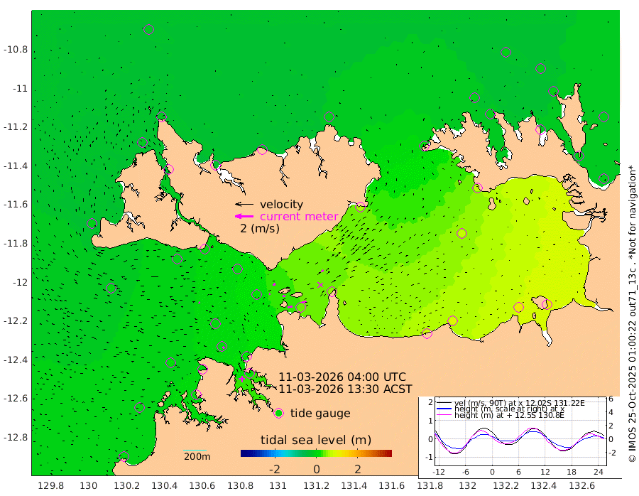 51cm/s 79T +4cm/s rms + 6cm/s 51T. Darwin_C1 52m 53cm/s 90T +4cm/s rms + 7cm/s -161T. Darwin_CW1 22m 10cm/s 73T +4cm/s rms + 8cm/s 61T. Darwin_CW2 34m 30cm/s 47T +3cm/s rms + 9cm/s 98T. Darwin_CW3 22m 30cm/s 92T +5cm/s rms + 7cm/s 88T. Darwin_C3 56m 30cm/s 67T +2cm/s rms + 9cm/s -126T. Darwin_CTbW 22m 17cm/s -81T +1cm/s rms + 1cm/s -47T. DARBGF 30m 26cm/s -53T +4cm/s rms + 3cm/s 80T. NRSDAR 19m -17cm Goodrich Bank 9cm Point Jenny 5cm Native Point 12cm Fish Reef 11cm Tapa Bay -1cm Point Fawcett (Offshore) 3cm Burge Point -8cm Munkunuwa 1cm Beagle A 1cm Parsons Bank 9cm Fenton Patches 17cm Hancox Shoal Area 17cm Nightcliff 14cm Darwin 8cm Charles Point Patches 45cm Glyde Point 88cm Chambers Bay 99cm Point Stuart 56cm Cape Hotham 78cm Christine Reef 114cm West Alligator Head 131cm East Field Island 70cm Two Hills Bay 57cm Camp Point 4cm Medina Inlet South -23cm South Barlow Point -15cm St. Asaph Bay -20cm Cape Van Dieman -23cm Snake Bay -10cm Cache Point -4cm Point Jahleel (Off) 14cm Cape Don -10cm Port Essington -8cm Smith Point - West -10cm NW Peacock Island -7cm North Of Jones Shoal -3cm Peacock Island -10cm Point David -12cm D'urville Point -8cm Copeland Island -6cm One Tree Point