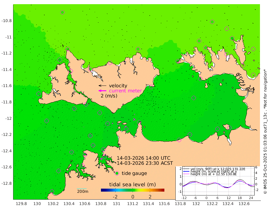 9cm/s -96T +4cm/s rms + 6cm/s 51T. Darwin_C1 52m 40cm/s -90T +4cm/s rms + 7cm/s -161T. Darwin_CW1 22m 19cm/s -109T +4cm/s rms + 8cm/s 61T. Darwin_CW2 34m 11cm/s -143T +3cm/s rms + 9cm/s 98T. Darwin_CW3 22m 29cm/s -93T +5cm/s rms + 7cm/s 88T. Darwin_C3 56m 1cm/s 14T +2cm/s rms + 9cm/s -126T. Darwin_CTbW 22m 5cm/s -105T +1cm/s rms + 1cm/s -47T. DARBGF 30m 6cm/s -65T +4cm/s rms + 3cm/s 80T. NRSDAR 19m 29cm Goodrich Bank -21cm Point Jenny -19cm Native Point -33cm Fish Reef -22cm Tapa Bay -1cm Point Fawcett (Offshore) -33cm Burge Point -28cm Munkunuwa -23cm Beagle A -21cm Parsons Bank -35cm Fenton Patches -20cm Hancox Shoal Area -33cm Nightcliff -30cm Darwin -24cm Charles Point Patches -20cm Glyde Point -20cm Chambers Bay -17cm Point Stuart -15cm Cape Hotham -13cm Christine Reef -22cm West Alligator Head -25cm East Field Island -7cm Two Hills Bay -9cm Camp Point -28cm Medina Inlet South 9cm South Barlow Point 11cm St. Asaph Bay 30cm Cape Van Dieman 33cm Snake Bay 28cm Cache Point 24cm Point Jahleel (Off) 14cm Cape Don 29cm Port Essington 30cm Smith Point - West 35cm NW Peacock Island 29cm North Of Jones Shoal 11cm Peacock Island 45cm Point David 35cm D'urville Point 43cm Copeland Island 38cm One Tree Point