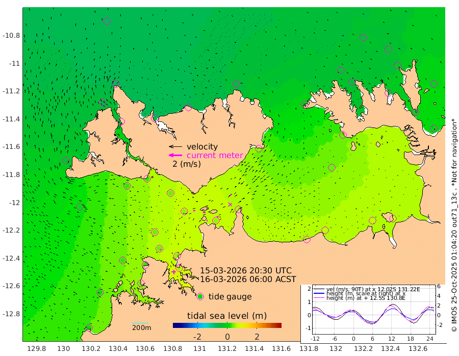 11cm/s 89T +4cm/s rms + 6cm/s 51T. Darwin_C1 52m 26cm/s 93T +4cm/s rms + 7cm/s -161T. Darwin_CW1 22m 25cm/s 66T +4cm/s rms + 8cm/s 61T. Darwin_CW2 34m 21cm/s 32T +3cm/s rms + 9cm/s 98T. Darwin_CW3 22m 37cm/s 88T +5cm/s rms + 7cm/s 88T. Darwin_C3 56m 0cm/s 149T +2cm/s rms + 9cm/s -126T. Darwin_CTbW 22m 10cm/s -75T +1cm/s rms + 1cm/s -47T. DARBGF 30m 15cm/s -55T +4cm/s rms + 3cm/s 80T. NRSDAR 19m -60cm Goodrich Bank 13cm Point Jenny 12cm Native Point 29cm Fish Reef 32cm Tapa Bay -27cm Point Fawcett (Offshore) 39cm Burge Point 26cm Munkunuwa 2cm Beagle A 43cm Parsons Bank 37cm Fenton Patches 51cm Hancox Shoal Area 54cm Nightcliff 60cm Darwin 41cm Charles Point Patches 53cm Glyde Point 66cm Chambers Bay 69cm Point Stuart 56cm Cape Hotham 44cm Christine Reef 77cm West Alligator Head 84cm East Field Island 45cm Two Hills Bay 47cm Camp Point 31cm Medina Inlet South -35cm South Barlow Point -46cm St. Asaph Bay -59cm Cape Van Dieman -54cm Snake Bay -56cm Cache Point -39cm Point Jahleel (Off) -9cm Cape Don -32cm Port Essington -35cm Smith Point - West -33cm NW Peacock Island -39cm North Of Jones Shoal -12cm Peacock Island -4cm Point David -30cm D'urville Point 1cm Copeland Island -9cm One Tree Point