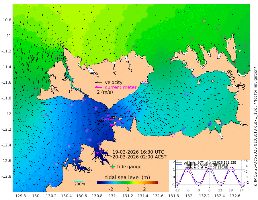 174cm/s -101T +4cm/s rms + 6cm/s 51T. Darwin_C1 52m 140cm/s -91T +4cm/s rms + 7cm/s -161T. Darwin_CW1 22m 90cm/s -106T +4cm/s rms + 8cm/s 61T. Darwin_CW2 34m 99cm/s -137T +3cm/s rms + 9cm/s 98T. Darwin_CW3 22m 154cm/s -91T +5cm/s rms + 7cm/s 88T. Darwin_C3 56m 93cm/s -116T +2cm/s rms + 9cm/s -126T. Darwin_CTbW 22m 9cm/s 160T +1cm/s rms + 1cm/s -47T. DARBGF 30m 18cm/s 161T +4cm/s rms + 3cm/s 80T. NRSDAR 19m 50cm Goodrich Bank -160cm Point Jenny -159cm Native Point -178cm Fish Reef -198cm Tapa Bay -40cm Point Fawcett (Offshore) -223cm Burge Point -180cm Munkunuwa -131cm Beagle A -223cm Parsons Bank -216cm Fenton Patches -231cm Hancox Shoal Area -244cm Nightcliff -259cm Darwin -216cm Charles Point Patches -207cm Glyde Point -195cm Chambers Bay -196cm Point Stuart -188cm Cape Hotham -177cm Christine Reef -215cm West Alligator Head -216cm East Field Island -159cm Two Hills Bay -161cm Camp Point -194cm Medina Inlet South -29cm South Barlow Point 7cm St. Asaph Bay 49cm Cape Van Dieman 36cm Snake Bay 42cm Cache Point 9cm Point Jahleel (Off) -57cm Cape Don 3cm Port Essington 2cm Smith Point - West 3cm NW Peacock Island 25cm North Of Jones Shoal 6cm Peacock Island -33cm Point David -3cm D'urville Point -38cm Copeland Island -27cm One Tree Point