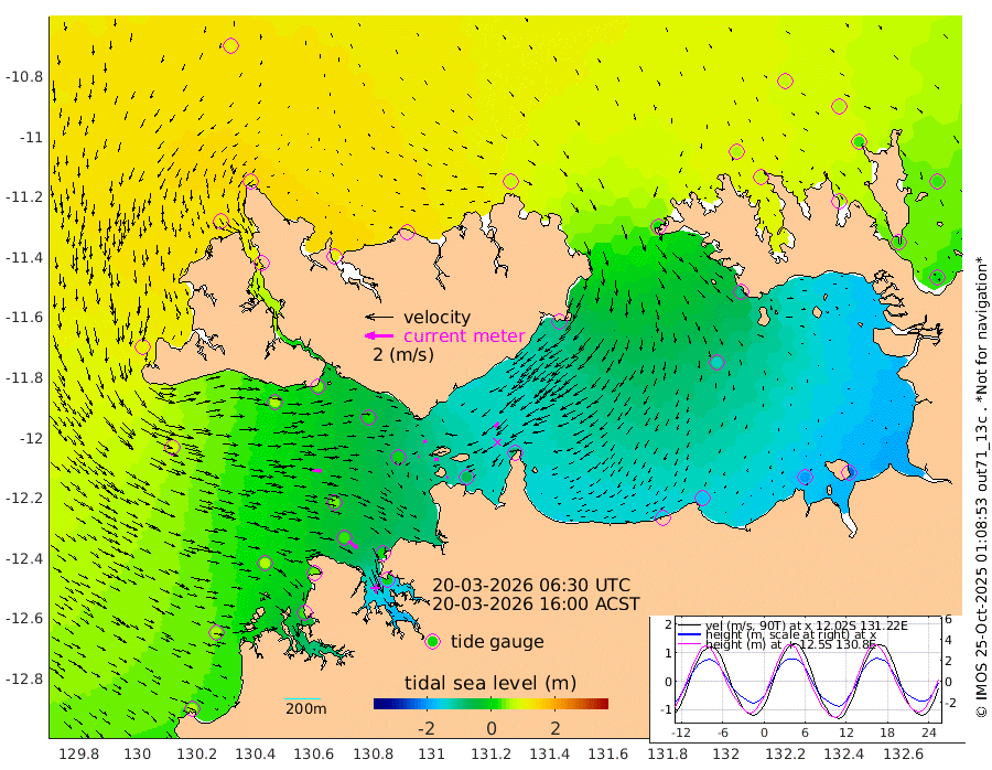 7cm/s 81T +4cm/s rms + 6cm/s 51T. Darwin_C1 52m 1cm/s -89T +4cm/s rms + 7cm/s -161T. Darwin_CW1 22m 6cm/s 72T +4cm/s rms + 8cm/s 61T. Darwin_CW2 34m 45cm/s -143T +3cm/s rms + 9cm/s 98T. Darwin_CW3 22m 30cm/s -87T +5cm/s rms + 7cm/s 88T. Darwin_C3 56m 24cm/s 61T +2cm/s rms + 9cm/s -126T. Darwin_CTbW 22m 76cm/s 96T +1cm/s rms + 1cm/s -47T. DARBGF 30m 83cm/s 127T +4cm/s rms + 3cm/s 80T. NRSDAR 19m 105cm Goodrich Bank 61cm Point Jenny 65cm Native Point 57cm Fish Reef 42cm Tapa Bay 110cm Point Fawcett (Offshore) 33cm Burge Point 61cm Munkunuwa 90cm Beagle A 18cm Parsons Bank 41cm Fenton Patches -9cm Hancox Shoal Area 10cm Nightcliff -5cm Darwin 23cm Charles Point Patches -57cm Glyde Point -150cm Chambers Bay -165cm Point Stuart -79cm Cape Hotham -130cm Christine Reef -192cm West Alligator Head -231cm East Field Island -99cm Two Hills Bay -97cm Camp Point 45cm Medina Inlet South 116cm South Barlow Point 118cm St. Asaph Bay 113cm Cape Van Dieman 111cm Snake Bay 102cm Cache Point 76cm Point Jahleel (Off) 20cm Cape Don 65cm Port Essington 71cm Smith Point - West 64cm NW Peacock Island 74cm North Of Jones Shoal 25cm Peacock Island 29cm Point David 66cm D'urville Point 21cm Copeland Island 31cm One Tree Point