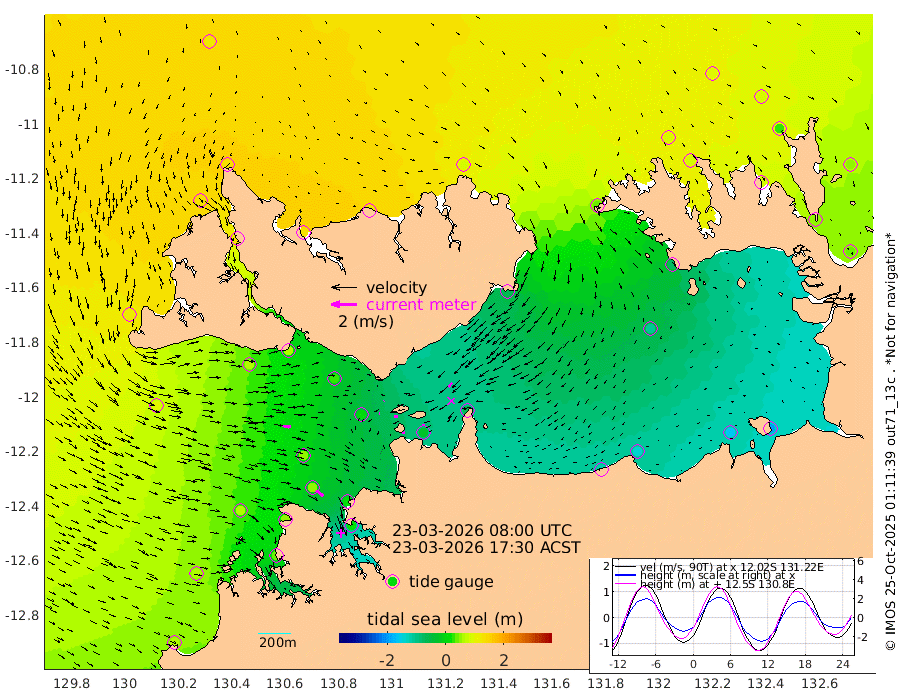21cm/s -100T +4cm/s rms + 6cm/s 51T. Darwin_C1 52m 17cm/s -91T +4cm/s rms + 7cm/s -161T. Darwin_CW1 22m 4cm/s 82T +4cm/s rms + 8cm/s 61T. Darwin_CW2 34m 44cm/s -138T +3cm/s rms + 9cm/s 98T. Darwin_CW3 22m 26cm/s -87T +5cm/s rms + 7cm/s 88T. Darwin_C3 56m 2cm/s 48T +2cm/s rms + 9cm/s -126T. Darwin_CTbW 22m 64cm/s 96T +1cm/s rms + 1cm/s -47T. DARBGF 30m 69cm/s 128T +4cm/s rms + 3cm/s 80T. NRSDAR 19m 120cm Goodrich Bank 63cm Point Jenny 67cm Native Point 64cm Fish Reef 51cm Tapa Bay 117cm Point Fawcett (Offshore) 41cm Burge Point 59cm Munkunuwa 90cm Beagle A 27cm Parsons Bank 47cm Fenton Patches 7cm Hancox Shoal Area 17cm Nightcliff 20cm Darwin 53cm Charles Point Patches -33cm Glyde Point -119cm Chambers Bay -137cm Point Stuart -57cm Cape Hotham -108cm Christine Reef -164cm West Alligator Head -194cm East Field Island -77cm Two Hills Bay -65cm Camp Point 57cm Medina Inlet South 124cm South Barlow Point 127cm St. Asaph Bay 126cm Cape Van Dieman 126cm Snake Bay 116cm Cache Point 90cm Point Jahleel (Off) 38cm Cape Don 86cm Port Essington 86cm Smith Point - West 82cm NW Peacock Island 94cm North Of Jones Shoal 32cm Peacock Island 52cm Point David 83cm D'urville Point 44cm Copeland Island 55cm One Tree Point