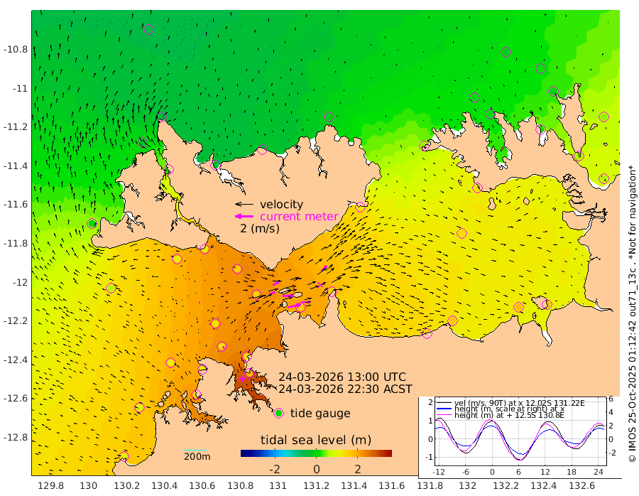 145cm/s 78T +4cm/s rms + 6cm/s 51T. Darwin_C1 52m 95cm/s 91T +4cm/s rms + 7cm/s -161T. Darwin_CW1 22m 68cm/s 73T +4cm/s rms + 8cm/s 61T. Darwin_CW2 34m 91cm/s 43T +3cm/s rms + 9cm/s 98T. Darwin_CW3 22m 120cm/s 90T +5cm/s rms + 7cm/s 88T. Darwin_C3 56m 72cm/s 65T +2cm/s rms + 9cm/s -126T. Darwin_CTbW 22m 15cm/s -65T +1cm/s rms + 1cm/s -47T. DARBGF 30m 24cm/s -37T +4cm/s rms + 3cm/s 80T. NRSDAR 19m -50cm Goodrich Bank 90cm Point Jenny 89cm Native Point 105cm Fish Reef 118cm Tapa Bay 2cm Point Fawcett (Offshore) 137cm Burge Point 105cm Munkunuwa 61cm Beagle A 156cm Parsons Bank 127cm Fenton Patches 155cm Hancox Shoal Area 145cm Nightcliff 171cm Darwin 134cm Charles Point Patches 150cm Glyde Point 150cm Chambers Bay 165cm Point Stuart 144cm Cape Hotham 136cm Christine Reef 180cm West Alligator Head 180cm East Field Island 134cm Two Hills Bay 121cm Camp Point 115cm Medina Inlet South 0cm South Barlow Point -33cm St. Asaph Bay -48cm Cape Van Dieman -35cm Snake Bay -40cm Cache Point -12cm Point Jahleel (Off) 51cm Cape Don 9cm Port Essington 9cm Smith Point - West 14cm NW Peacock Island -19cm North Of Jones Shoal -2cm Peacock Island 62cm Point David 22cm D'urville Point 67cm Copeland Island 51cm One Tree Point