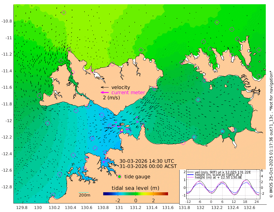 100cm/s -101T +4cm/s rms + 6cm/s 51T. Darwin_C1 52m 92cm/s -91T +4cm/s rms + 7cm/s -161T. Darwin_CW1 22m 63cm/s -107T +4cm/s rms + 8cm/s 61T. Darwin_CW2 34m 60cm/s -137T +3cm/s rms + 9cm/s 98T. Darwin_CW3 22m 97cm/s -91T +5cm/s rms + 7cm/s 88T. Darwin_C3 56m 51cm/s -116T +2cm/s rms + 9cm/s -126T. Darwin_CTbW 22m 8cm/s -136T +1cm/s rms + 1cm/s -47T. DARBGF 30m 6cm/s -134T +4cm/s rms + 3cm/s 80T. NRSDAR 19m 38cm Goodrich Bank -127cm Point Jenny -126cm Native Point -144cm Fish Reef -147cm Tapa Bay -35cm Point Fawcett (Offshore) -175cm Burge Point -139cm Munkunuwa -115cm Beagle A -162cm Parsons Bank -173cm Fenton Patches -160cm Hancox Shoal Area -170cm Nightcliff -183cm Darwin -155cm Charles Point Patches -143cm Glyde Point -124cm Chambers Bay -126cm Point Stuart -125cm Cape Hotham -114cm Christine Reef -138cm West Alligator Head -139cm East Field Island -99cm Two Hills Bay -102cm Camp Point -143cm Medina Inlet South -23cm South Barlow Point 2cm St. Asaph Bay 36cm Cape Van Dieman 35cm Snake Bay 31cm Cache Point 12cm Point Jahleel (Off) -32cm Cape Don 10cm Port Essington 9cm Smith Point - West 13cm NW Peacock Island 32cm North Of Jones Shoal 10cm Peacock Island -1cm Point David 9cm D'urville Point -5cm Copeland Island 3cm One Tree Point