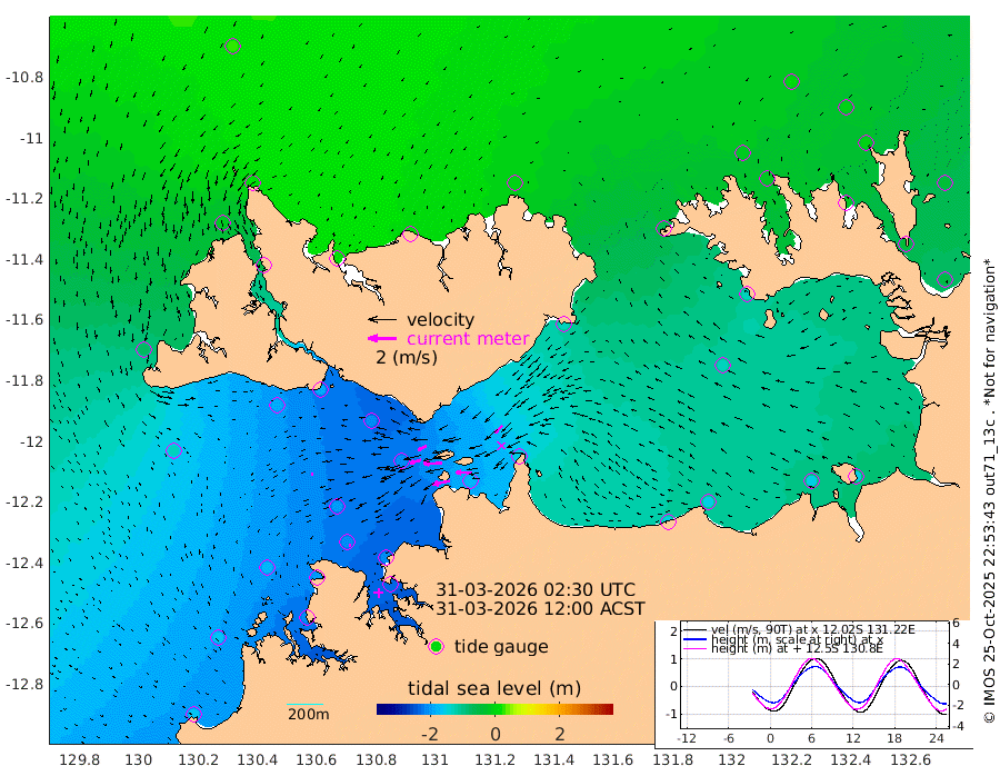 128cm/s -101T +4cm/s rms + 6cm/s 51T. Darwin_C1 52m 111cm/s -91T +4cm/s rms + 7cm/s -161T. Darwin_CW1 22m 81cm/s -106T +4cm/s rms + 8cm/s 61T. Darwin_CW2 34m 74cm/s -136T +3cm/s rms + 9cm/s 98T. Darwin_CW3 22m 131cm/s -91T +5cm/s rms + 7cm/s 88T. Darwin_C3 56m 66cm/s -116T +2cm/s rms + 9cm/s -126T. Darwin_CTbW 22m 16cm/s -115T +1cm/s rms + 1cm/s -47T. DARBGF 30m 10cm/s -102T +4cm/s rms + 3cm/s 80T. NRSDAR 19m 23cm Goodrich Bank -164cm Point Jenny -162cm Native Point -178cm Fish Reef -192cm Tapa Bay -70cm Point Fawcett (Offshore) -212cm Burge Point -180cm Munkunuwa -130cm Beagle A -206cm Parsons Bank -193cm Fenton Patches -203cm Hancox Shoal Area -208cm Nightcliff -231cm Darwin -206cm Charles Point Patches -174cm Glyde Point -151cm Chambers Bay -148cm Point Stuart -153cm Cape Hotham -129cm Christine Reef -157cm West Alligator Head -148cm East Field Island -124cm Two Hills Bay -128cm Camp Point -187cm Medina Inlet South -48cm South Barlow Point -20cm St. Asaph Bay 18cm Cape Van Dieman 13cm Snake Bay 13cm Cache Point -7cm Point Jahleel (Off) -62cm Cape Don -19cm Port Essington -12cm Smith Point - West -10cm NW Peacock Island 6cm North Of Jones Shoal 0cm Peacock Island -43cm Point David -16cm D'urville Point -45cm Copeland Island -38cm One Tree Point