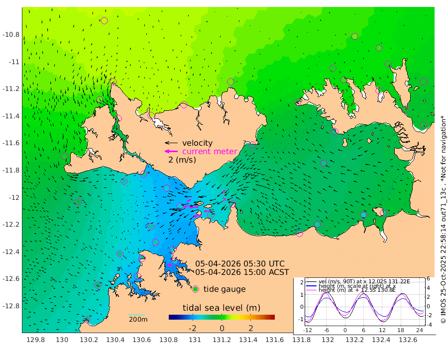 133cm/s -101T +4cm/s rms + 6cm/s 51T. Darwin_C1 52m 111cm/s -91T +4cm/s rms + 7cm/s -161T. Darwin_CW1 22m 74cm/s -106T +4cm/s rms + 8cm/s 61T. Darwin_CW2 34m 69cm/s -135T +3cm/s rms + 9cm/s 98T. Darwin_CW3 22m 134cm/s -91T +5cm/s rms + 7cm/s 88T. Darwin_C3 56m 67cm/s -116T +2cm/s rms + 9cm/s -126T. Darwin_CTbW 22m 7cm/s 168T +1cm/s rms + 1cm/s -47T. DARBGF 30m 13cm/s 174T +4cm/s rms + 3cm/s 80T. NRSDAR 19m 69cm Goodrich Bank -78cm Point Jenny -76cm Native Point -97cm Fish Reef -108cm Tapa Bay 3cm Point Fawcett (Offshore) -117cm Burge Point -108cm Munkunuwa -43cm Beagle A -136cm Parsons Bank -106cm Fenton Patches -136cm Hancox Shoal Area -131cm Nightcliff -155cm Darwin -123cm Charles Point Patches -118cm Glyde Point -115cm Chambers Bay -120cm Point Stuart -106cm Cape Hotham -95cm Christine Reef -134cm West Alligator Head -128cm East Field Island -93cm Two Hills Bay -81cm Camp Point -110cm Medina Inlet South 12cm South Barlow Point 40cm St. Asaph Bay 67cm Cape Van Dieman 60cm Snake Bay 64cm Cache Point 37cm Point Jahleel (Off) -18cm Cape Don 22cm Port Essington 23cm Smith Point - West 25cm NW Peacock Island 44cm North Of Jones Shoal 13cm Peacock Island -6cm Point David 18cm D'urville Point -12cm Copeland Island -2cm One Tree Point