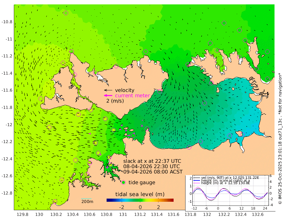 64cm/s 78T +4cm/s rms + 6cm/s 51T. Darwin_C1 52m 29cm/s 88T +4cm/s rms + 7cm/s -161T. Darwin_CW1 22m 48cm/s 72T +4cm/s rms + 8cm/s 61T. Darwin_CW2 34m 10cm/s 142T +3cm/s rms + 9cm/s 98T. Darwin_CW3 22m 43cm/s 86T +5cm/s rms + 7cm/s 88T. Darwin_C3 56m 46cm/s 63T +2cm/s rms + 9cm/s -126T. Darwin_CTbW 22m 48cm/s 90T +1cm/s rms + 1cm/s -47T. DARBGF 30m 49cm/s 119T +4cm/s rms + 3cm/s 80T. NRSDAR 19m 36cm Goodrich Bank 82cm Point Jenny 85cm Native Point 75cm Fish Reef 84cm Tapa Bay 62cm Point Fawcett (Offshore) 84cm Burge Point 103cm Munkunuwa 79cm Beagle A 83cm Parsons Bank 82cm Fenton Patches 68cm Hancox Shoal Area 79cm Nightcliff 72cm Darwin 77cm Charles Point Patches 3cm Glyde Point -69cm Chambers Bay -92cm Point Stuart -27cm Cape Hotham -50cm Christine Reef -105cm West Alligator Head -138cm East Field Island -52cm Two Hills Bay -45cm Camp Point 84cm Medina Inlet South 74cm South Barlow Point 61cm St. Asaph Bay 40cm Cape Van Dieman 39cm Snake Bay 29cm Cache Point 24cm Point Jahleel (Off) 7cm Cape Don 20cm Port Essington 27cm Smith Point - West 19cm NW Peacock Island 17cm North Of Jones Shoal 5cm Peacock Island -2cm Point David 23cm D'urville Point -4cm Copeland Island -2cm One Tree Point