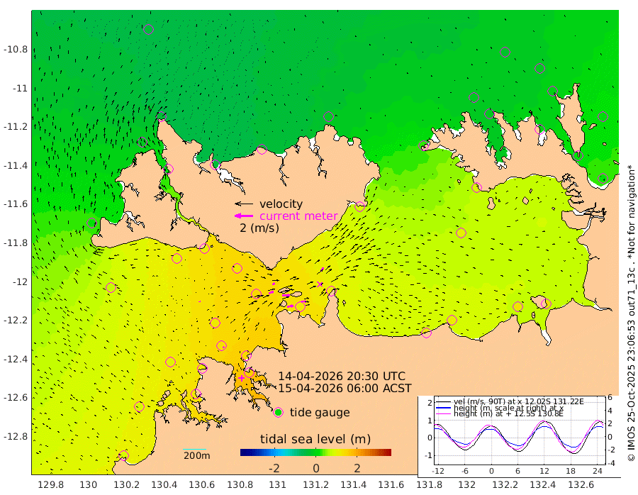 65cm/s 80T +4cm/s rms + 6cm/s 51T. Darwin_C1 52m 55cm/s 93T +4cm/s rms + 7cm/s -161T. Darwin_CW1 22m 56cm/s 71T +4cm/s rms + 8cm/s 61T. Darwin_CW2 34m 48cm/s 40T +3cm/s rms + 9cm/s 98T. Darwin_CW3 22m 86cm/s 89T +5cm/s rms + 7cm/s 88T. Darwin_C3 56m 30cm/s 66T +2cm/s rms + 9cm/s -126T. Darwin_CTbW 22m 6cm/s -25T +1cm/s rms + 1cm/s -47T. DARBGF 30m 12cm/s -39T +4cm/s rms + 3cm/s 80T. NRSDAR 19m -44cm Goodrich Bank 88cm Point Jenny 86cm Native Point 99cm Fish Reef 115cm Tapa Bay 15cm Point Fawcett (Offshore) 121cm Burge Point 95cm Munkunuwa 68cm Beagle A 122cm Parsons Bank 121cm Fenton Patches 136cm Hancox Shoal Area 142cm Nightcliff 147cm Darwin 125cm Charles Point Patches 121cm Glyde Point 126cm Chambers Bay 120cm Point Stuart 113cm Cape Hotham 105cm Christine Reef 132cm West Alligator Head 137cm East Field Island 93cm Two Hills Bay 99cm Camp Point 105cm Medina Inlet South 1cm South Barlow Point -16cm St. Asaph Bay -43cm Cape Van Dieman -38cm Snake Bay -38cm Cache Point -17cm Point Jahleel (Off) 24cm Cape Don -11cm Port Essington -11cm Smith Point - West -12cm NW Peacock Island -24cm North Of Jones Shoal -7cm Peacock Island 16cm Point David -8cm D'urville Point 22cm Copeland Island 10cm One Tree Point
