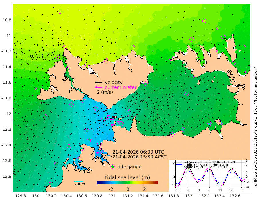154cm/s -101T +4cm/s rms + 6cm/s 51T. Darwin_C1 52m 116cm/s -90T +4cm/s rms + 7cm/s -161T. Darwin_CW1 22m 75cm/s -107T +4cm/s rms + 8cm/s 61T. Darwin_CW2 34m 76cm/s -134T +3cm/s rms + 9cm/s 98T. Darwin_CW3 22m 122cm/s -91T +5cm/s rms + 7cm/s 88T. Darwin_C3 56m 83cm/s -115T +2cm/s rms + 9cm/s -126T. Darwin_CTbW 22m 6cm/s -175T +1cm/s rms + 1cm/s -47T. DARBGF 30m 11cm/s -170T +4cm/s rms + 3cm/s 80T. NRSDAR 19m 86cm Goodrich Bank -73cm Point Jenny -71cm Native Point -85cm Fish Reef -99cm Tapa Bay 20cm Point Fawcett (Offshore) -115cm Burge Point -107cm Munkunuwa -38cm Beagle A -133cm Parsons Bank -103cm Fenton Patches -129cm Hancox Shoal Area -129cm Nightcliff -138cm Darwin -98cm Charles Point Patches -105cm Glyde Point -101cm Chambers Bay -110cm Point Stuart -98cm Cape Hotham -92cm Christine Reef -125cm West Alligator Head -116cm East Field Island -83cm Two Hills Bay -67cm Camp Point -97cm Medina Inlet South 25cm South Barlow Point 55cm St. Asaph Bay 83cm Cape Van Dieman 77cm Snake Bay 80cm Cache Point 51cm Point Jahleel (Off) -4cm Cape Don 41cm Port Essington 38cm Smith Point - West 40cm NW Peacock Island 64cm North Of Jones Shoal 19cm Peacock Island 7cm Point David 33cm D'urville Point 0cm Copeland Island 15cm One Tree Point
